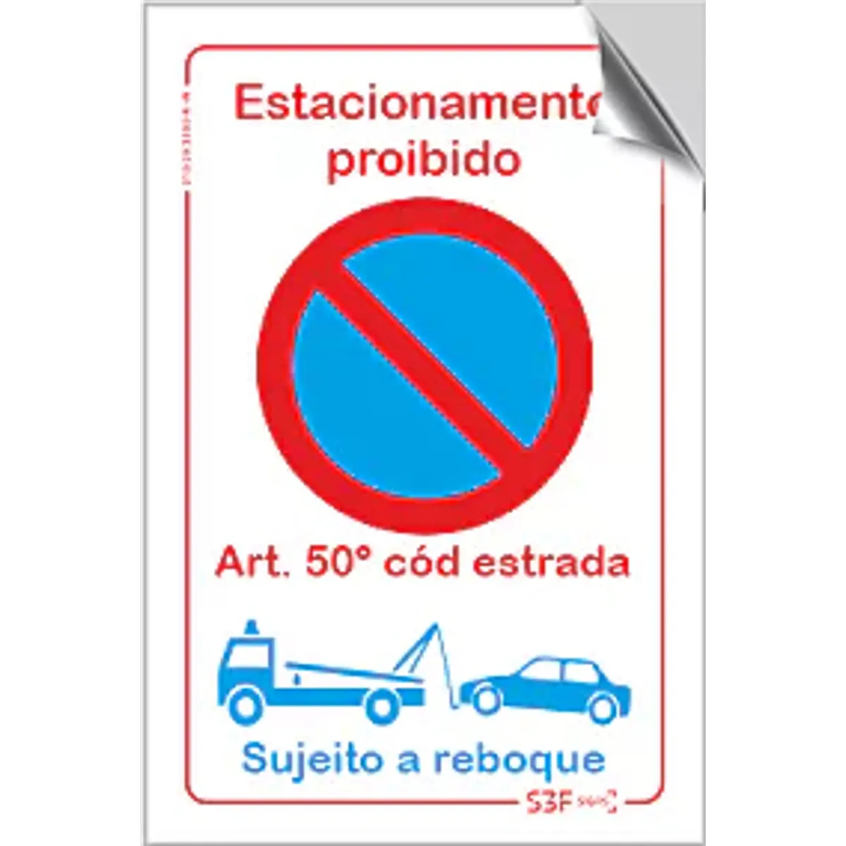 Vinil autocolante de sinalização ''Estacionamento proibido [Art. 50] Sujeito a Reboque'' - 200x300mm