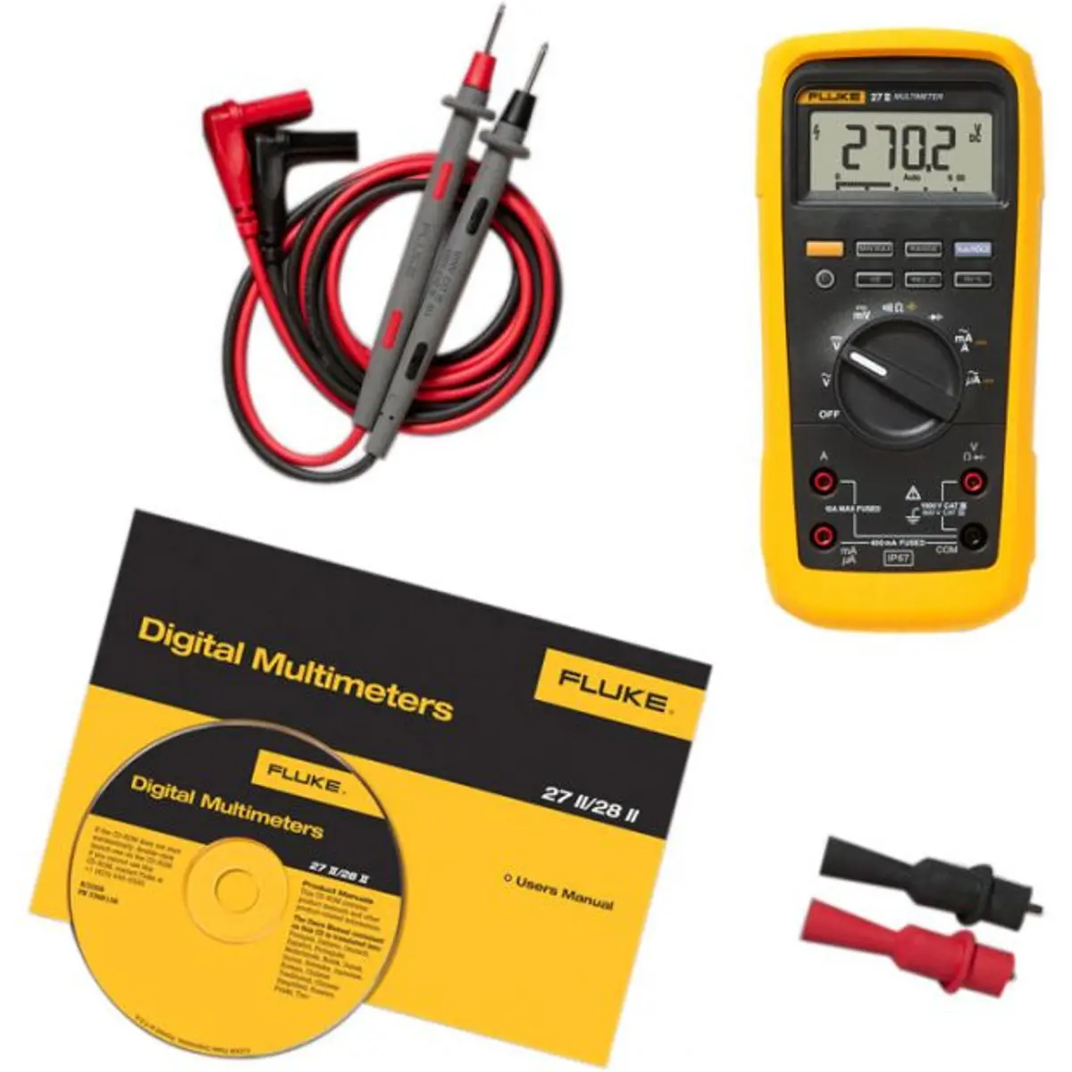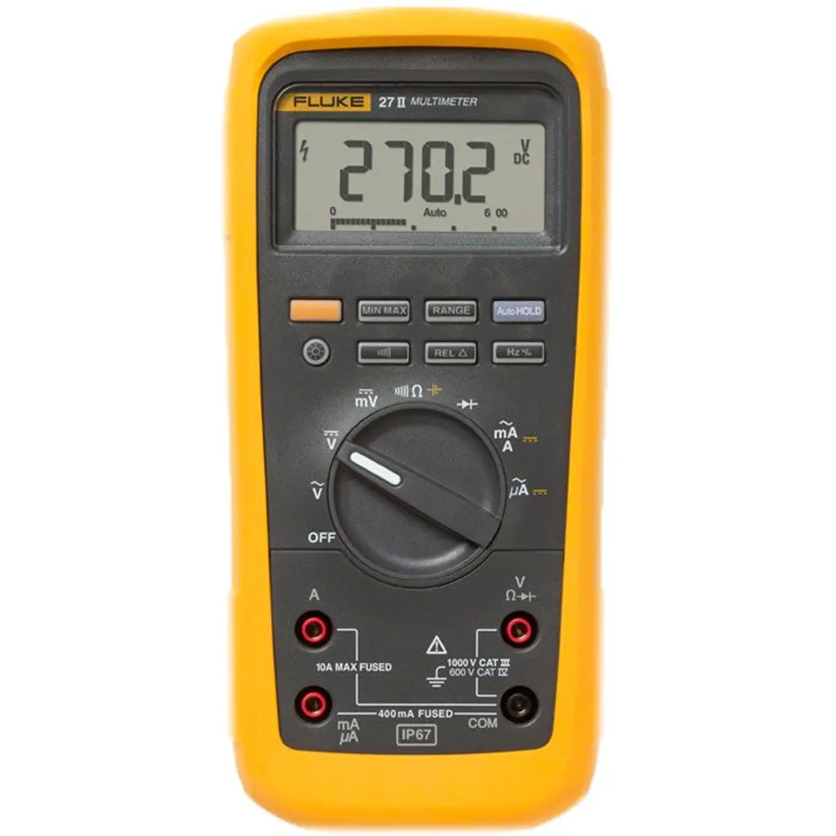 O multímetro digital Fluke 27-II estabelece um novo padrão de funcionamento em condições de trabalho difíceis, garantindo as funcionalidades e a precisão necessárias para detectar a maioria dos problemas eléctricos. Tem classificação IP67 (resistência ao pó e à água), aprovações MSHA, uma gama de temperatura de funcionamento maior, de -15°C a +55°C (5°F a 131°F, -40°C até 20 minutos) e 95% de humidade, e foi concebido e testado para resistir a uma queda de 3 metros (10 pés). Os multímetros Fluke da série 20 são concebidos para funcionar nos ambientes mais exigentes.