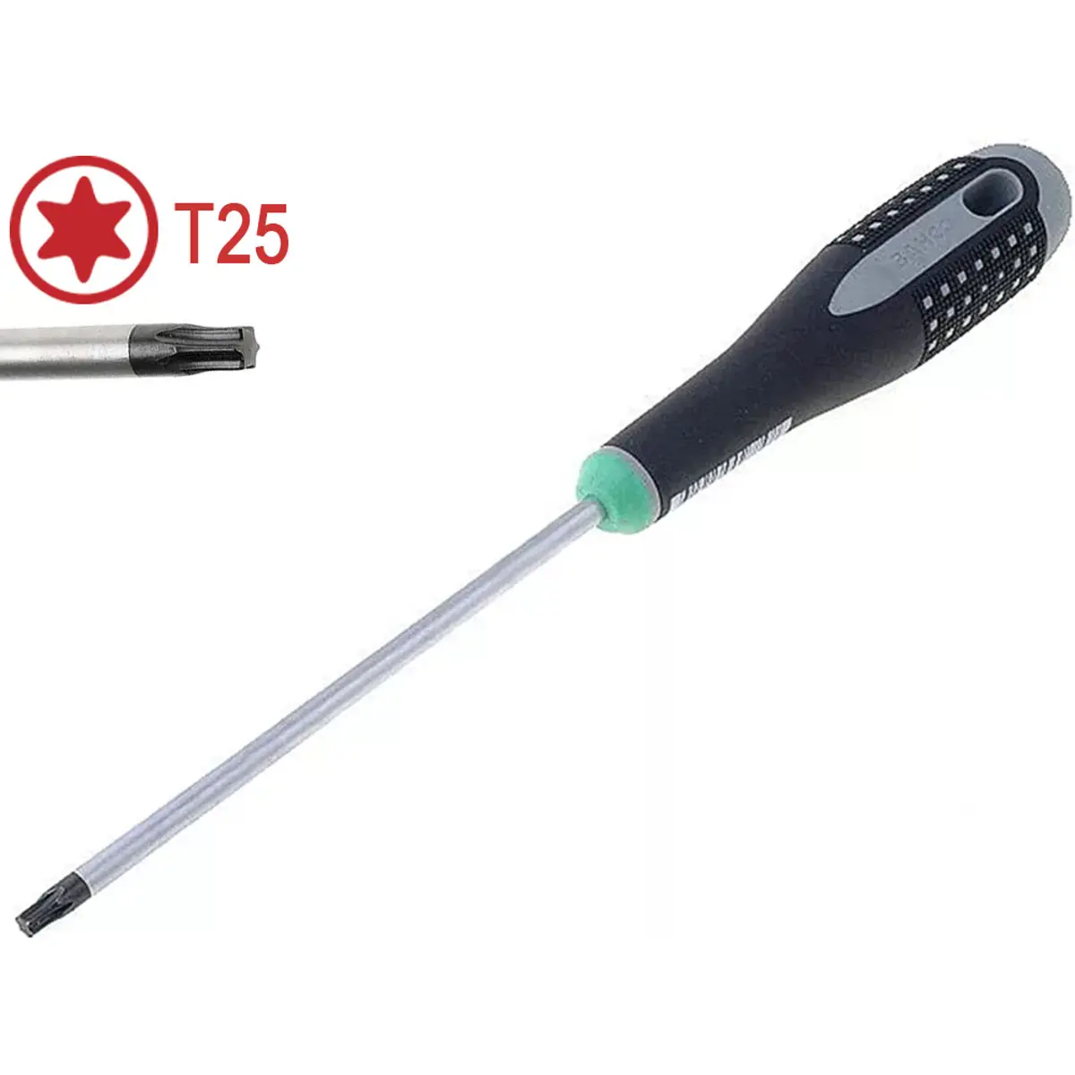 Chave de fendas do tipo Torx T25 (TX25), com cabo ergonómico antiderrapante, uma cor que facilita a identificação do tipo de ponta e orifício para pendurar.