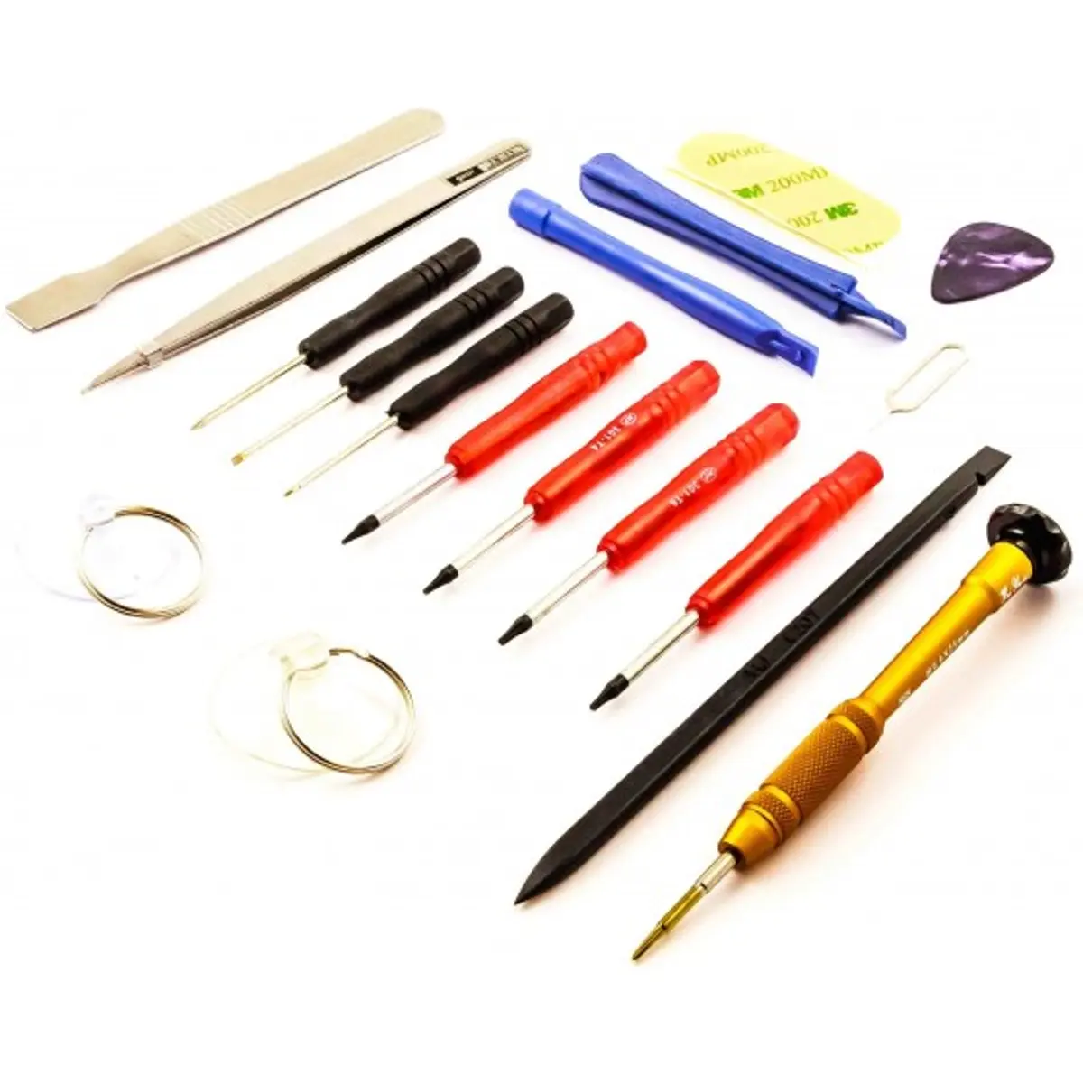 Conjunto de ferramentas para abrir tablets, smartphones e outros dispositivos, com chaves Torx T3 a T6, Pentalobe, chave de fenda cruz, fenda, ventosas, pinças, alavancas plásticas, suportes, sifão metálico, extrator de SIM, plectro e fita adesiva universal 50x28mm. Ideal para abrir dispositivos com cuidado, remover capas traseiras e baterias, substituir componentes internos e reparar sem danificar o ecrã, com várias opções de alavanca, sucção e fixação para uma reparação segura.