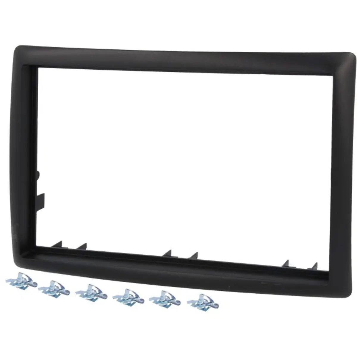 Moldura de montagem para rádio 2 DIN, em preto, compatível com Renault Megane II (2002/11 a 2009/05). Possui abertura de 112 x 182 mm e aro de encaixe de 118 x 188 mm no painel, facilitando a instalação de rádio no painel do veículo.