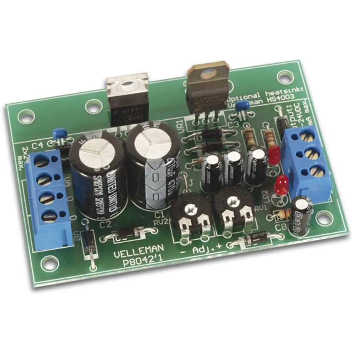 Kit de montagem com fonte de alimentação simétrica de baixo custo, adequada para amplificadores operacionais. Oferece saída positiva e negativa regulável entre 1.2 e 24VDC, com corrente até 2x1A contínua quando montado com dissipador. A entrada admite 2x24VAC, com ótima regulação de linha e de carga e baixo ripple. Possui indicadores LED na saída e dimensões compactas (78x52x24 mm). Proteções: curto-circuito e térmica. Dissipador opcional HS4003 para dissipação até 20W. Os trimmers podem ser substituídos por potenciómetros para ajuste contínuo da tensão de saída.