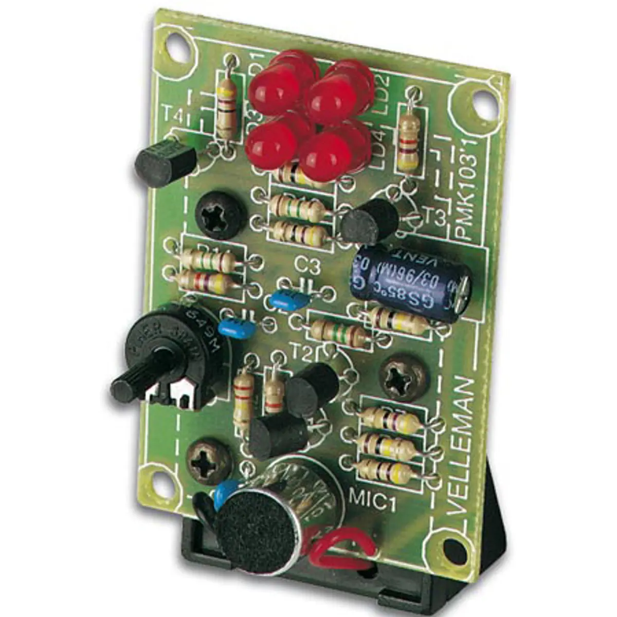 Este kit é constituído por 4 LEDs de alto brilho que reagem simultaneamente a qualquer som. Pode ter várias aplicações práticas e divertidas, tais como: indicador de som, simples modulador de luz, indicador de telefone ou campainha de porta.