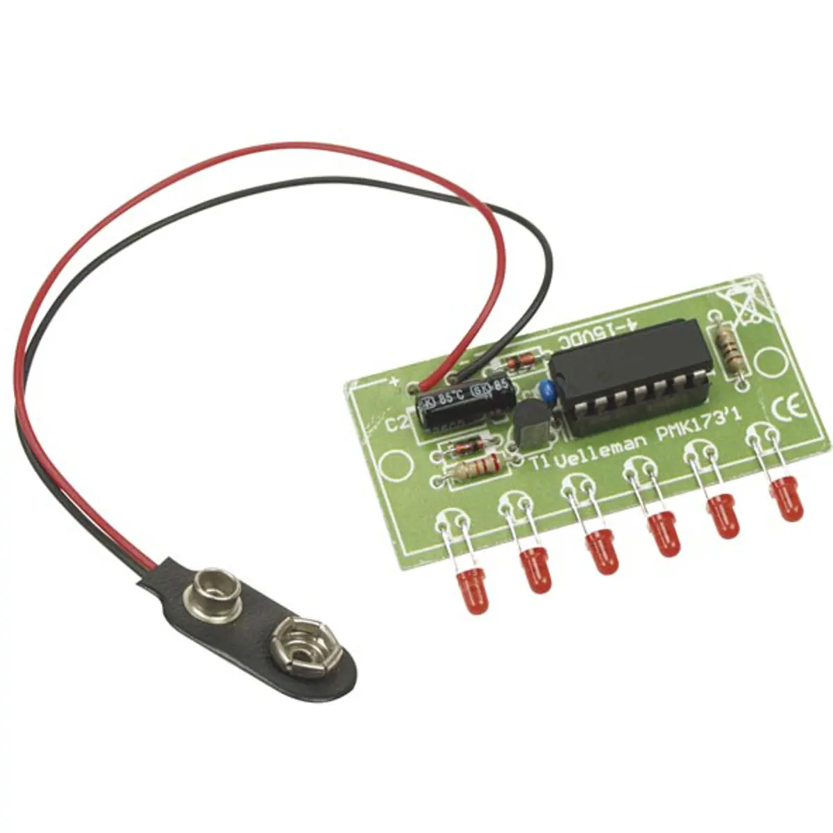 Kit de montagem compacto com 6 LEDs para efeitos de iluminação sequencial. Ideal para chamar a atenção em lojas, feiras e exposições, bem como em aplicações de decoração, cenários, filmes, brinquedos e modelismo. Alimentado entre 4 e 15 V DC (20 mA a 12 V DC). Velocidade de deslocação fixa em 0,5 segundos, permitindo um efeito suave e previsível. Dimensões: 55 x 25 x 10 mm; pequeno, fácil de integrar em projetos e displays.