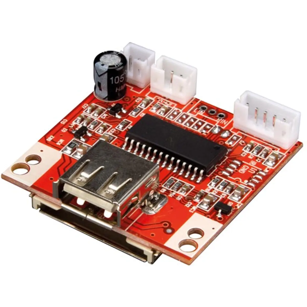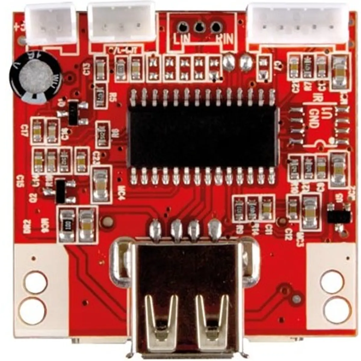 Este módulo jukebox MP3 reproduz ficheiros MP3 desde pen USB ou cartão SD, ideal para automóveis. Reproduz automaticamente ao ligar, possui botões de seguinte, anterior e play/pause, LED indicador e função de repetição de todas as faixas. Suporta MP3 a 128-320 kbps com saída de áudio estéreo 500 mV/47kOhm. Alimenta-se com 5 VDC ou 9-12 VDC, tem dimensões compactas de 45 x 40 x 8 mm.