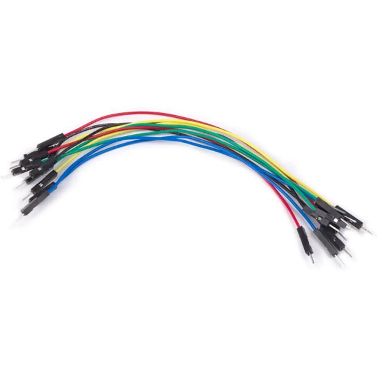 Conjunto de cabos de ligação tipo jumper macho-macho com 150 mm de comprimento, condutor de cobre e isolamento em PVC. Disponível em 5 cores (vermelho, azul, amarelo, verde e preto). Fios pré-cortados, com terminais pré-formados para prototipagem rápida. Tensão máxima de 30 V e corrente máxima de 3 A. Ideais para ligações em placas de prototipagem e montagens de protótipos, facilitando ligações entre componentes sem necessidade de soldar.
