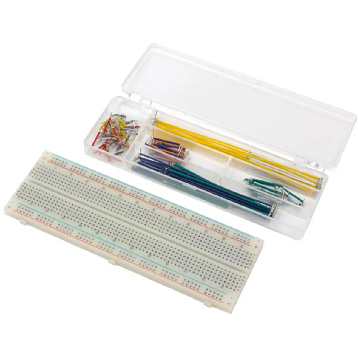Placa de ensaio com 830 pontos de ligação, capaz de suportar até 30V e 3A, fabricada em ABS e aço inoxidável. Com base de suporte, duas bus strips e dimensões de 165,5 x 56,5 x 8,5 mm para prototipagem rápida de circuitos; com caixa de fios jumper de dimensões 170 x 55 x 18 mm. Ideal para montagem de protótipos, testes eletrónicos e ensino de electrónica.