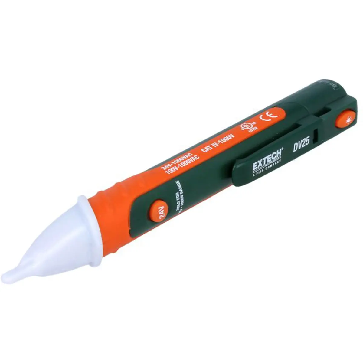 Detector de tensão sem contacto com detecção de 24..1000VAC em 50/60Hz, adequado para uso profissional. Oferece indicação segura sem contacto direto, com grau de poluição 2 e alimentação por 2x AAA; inclui lanterna integrada. Em conformidade com EN61010 CAT IV (1000V), é compacto (Ø25x159mm) e leve (42g), ideal para trabalhos elétricos em oficinas, instalações e manutenção.