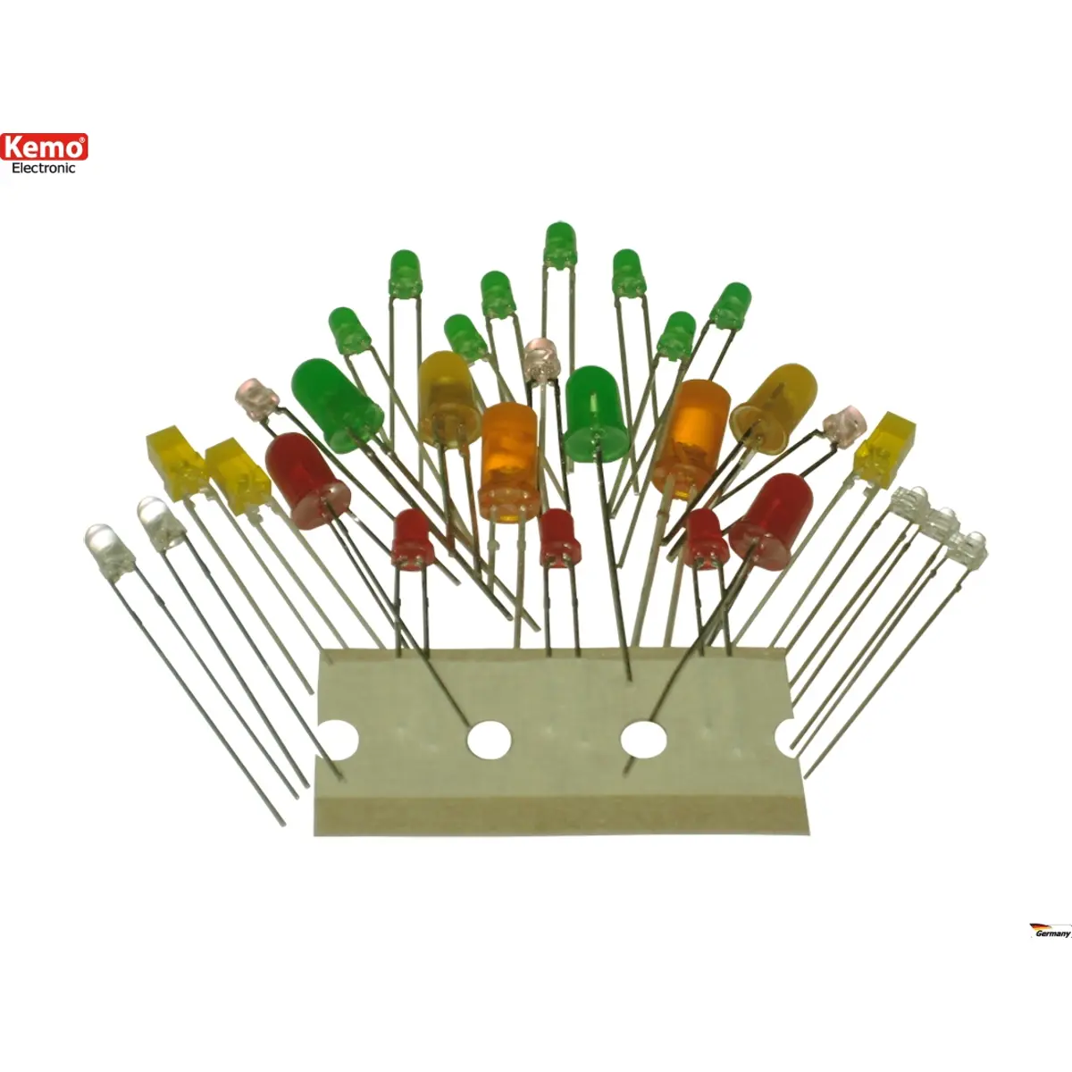Contém LEDs padrão de diferentes cores e formatos. Todos os LEDs funcionam com corrente de 10 mA ou menos. Cada LED deve ser colocado em operação usando uma resistência em série, que limita - de acordo com a tensão de operação - a corrente a 10 mA ou menos. Os LEDs só podem ser usados ​​com tensão contínua.