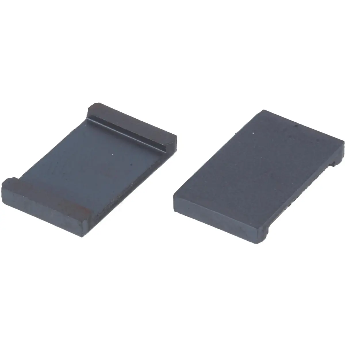 Filtro de ferrite para cabos planos que reduz interferências eletromagnéticas, apresentando impedância de 27 Ohm a 25 MHz e impedância a 100 MHz especificada. As dimensões são A: 16.5 mm, B: 2 mm, C: 10.25 mm, D: 12.5 mm e E: 0.6 mm, tornando-o adequado para montagem com controlo de ruído essencial.