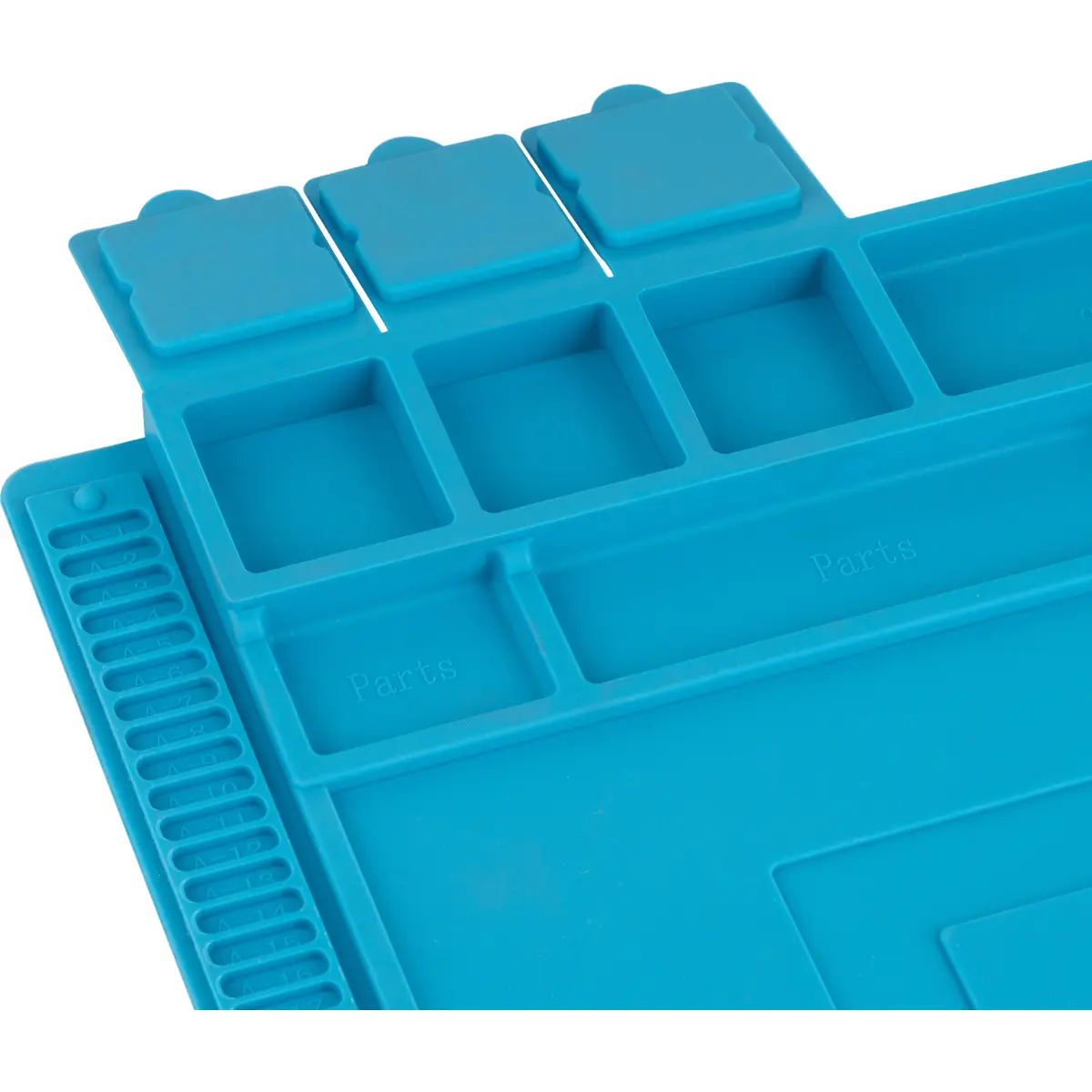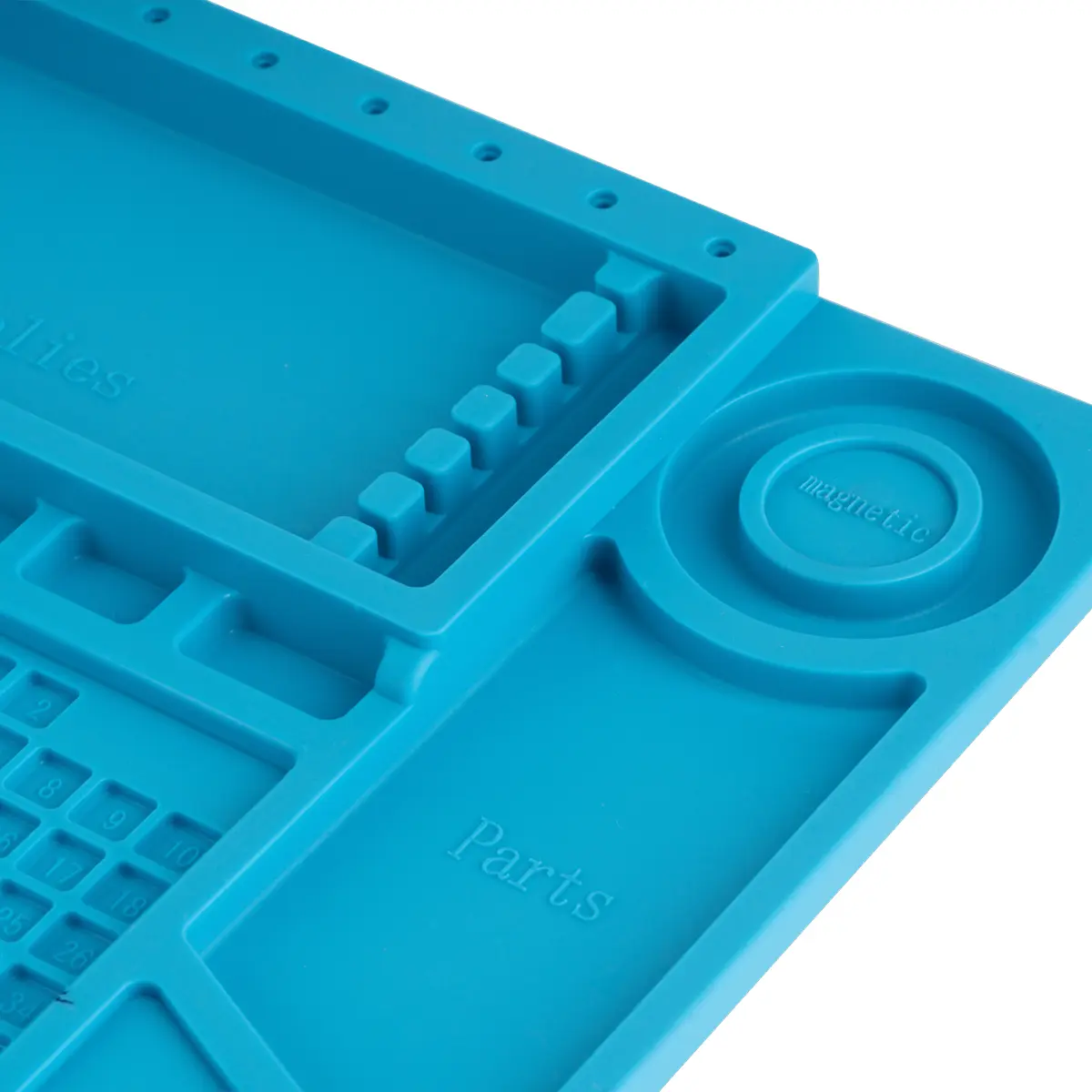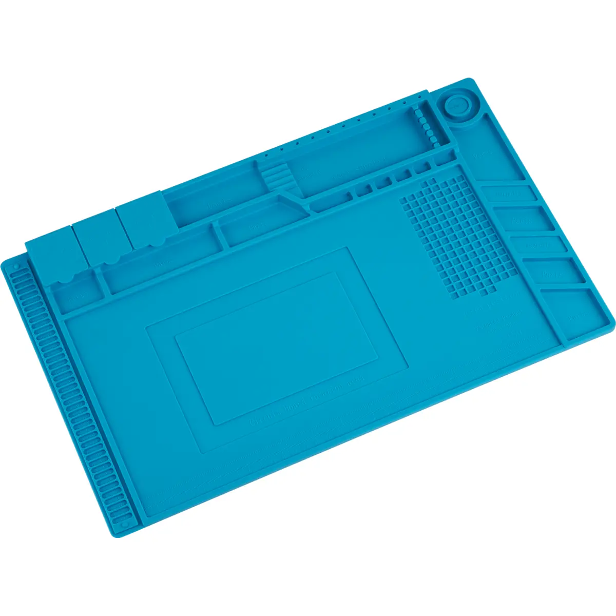 Tapete de silicone anti-estático para soldaduras com resistência térmica até 500 °C, superfície flexível que regenera a sua forma original. Inclui três caixas de arrumação, três áreas magnéticas e compartimentos para parafusos, além de superfície antiderrapante e resistente a cola. Ideal para trabalhos de soldadura e reparação, proporcionando organização segura de ferramentas, peças e acessórios. Dimensões 450x300 mm, peso 678 g. Minimiza quedas e descargas elétricas, mantendo o ambiente de trabalho limpo e eficiente.