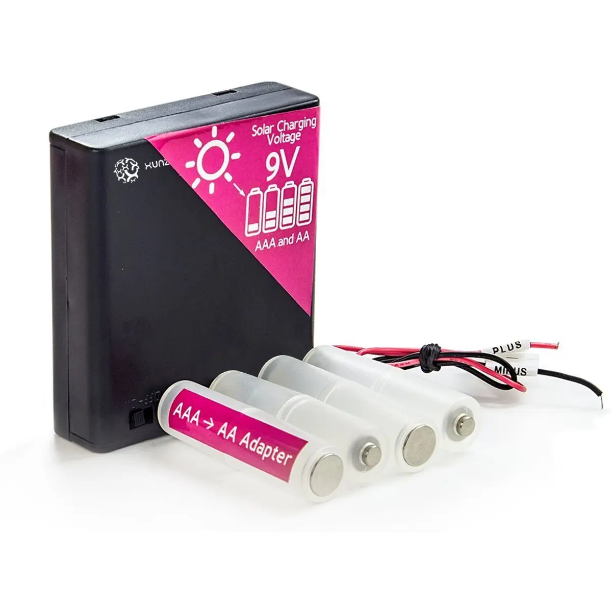 Carregador de baterias microsolar capaz de alimentar 4 pilhas AA/AAA via energia solar. Inclui caixa de baterias universal e adaptadores AAA para AA, ideal para educação, ciência, robótica e projetos educativos de energia solar. Perfeito para experiências de ensino e prototipagem com painéis fotovoltaicos, promovendo aprendizagem prática sobre conversão de energia e sustentabilidade.