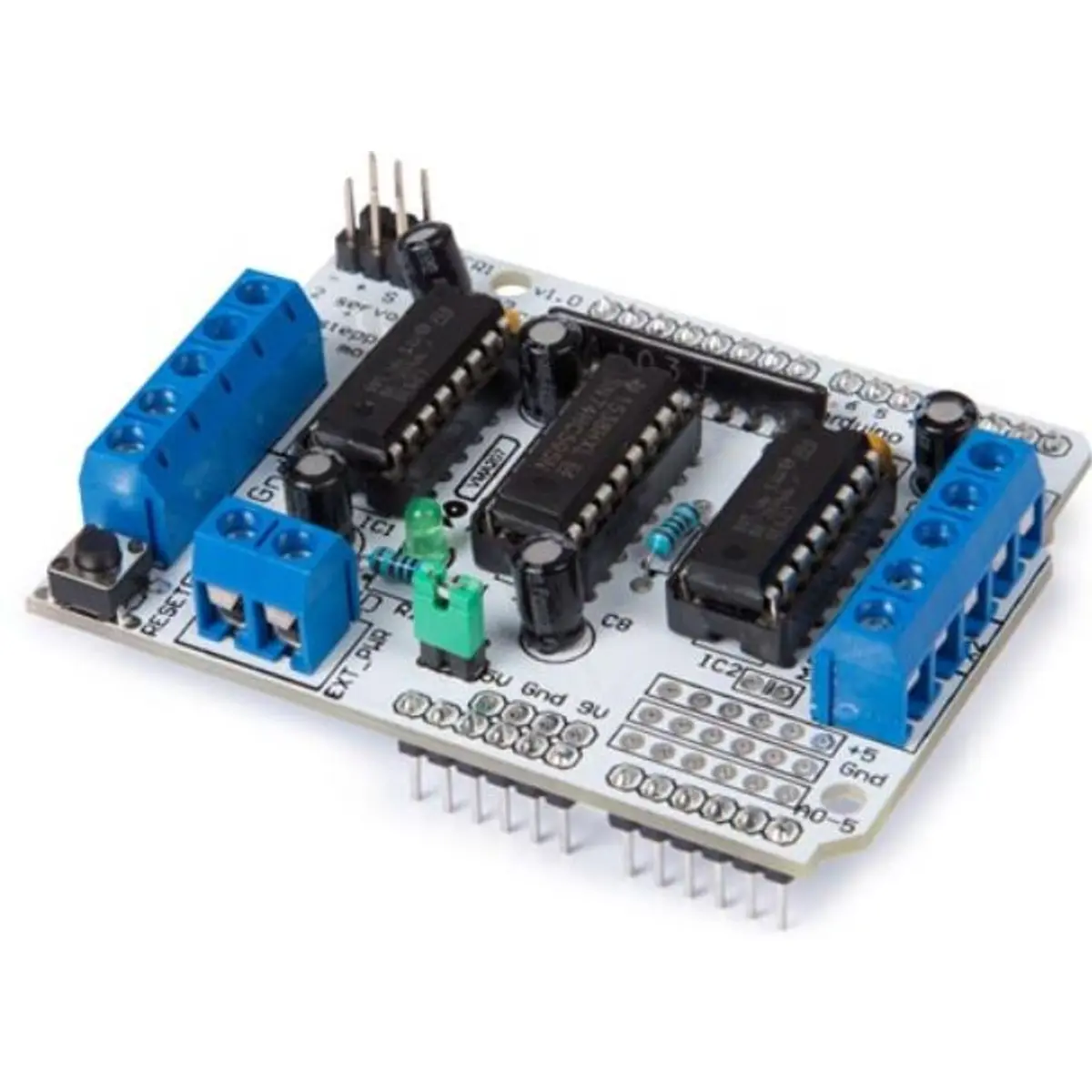 O L293D inclui dois controladores de motor L293D e um registador de deslocamento 74HC595. O registador de deslocamento aumenta os 3 pinos do Arduino para 8 pinos de modo a controlar a direcção para os controladores do motor. A saída activa do L293D é ligada diretamente às saídas PWM do Arduino.