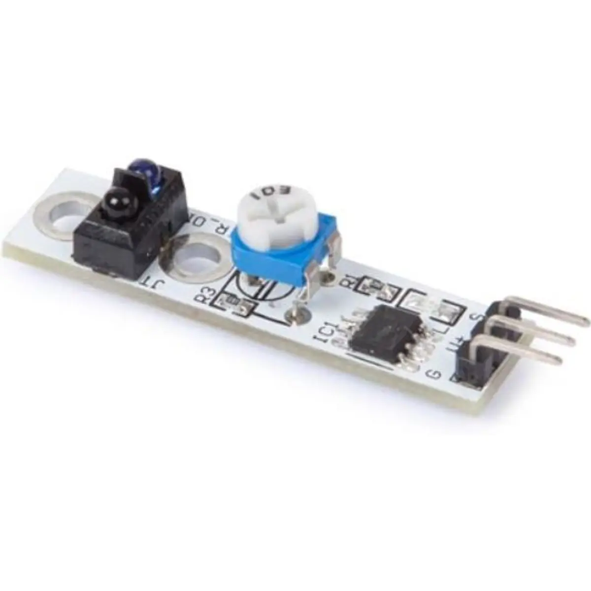 O Sensor de Seguimento de Linha baseado com base no TCRT5000 da Vishay é um tipo de sensor de reflectância infravermelho, é vulgarmente usado para rastrear robot e é montado na parte inferior do chassi do robot. O sensor de seguimento de linha funciona através da detecção da luz refletida proveniente de seu próprio LED infravermelho e medindo a quantidade de luz infravermelha refletida e pode detectar transições da claridade para o escuro (linhas) ou mesmo objetos diretamente na sua frente.