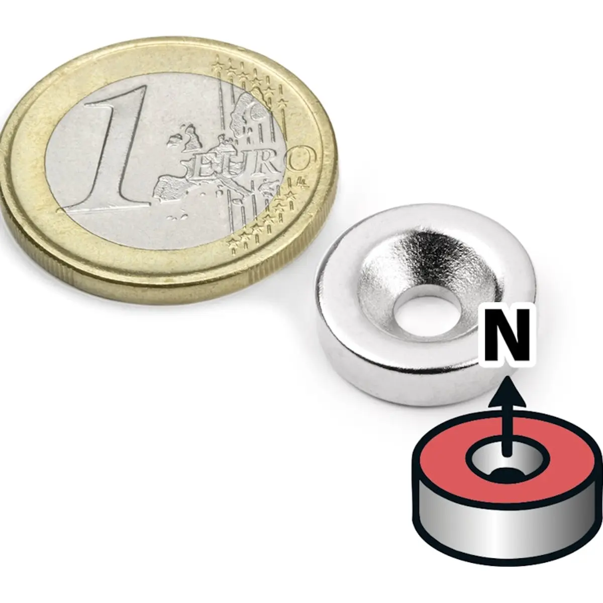 Ímanes de disco de neodímio com furação escareada e altura de 4 mm, que podem ser fixados com um parafuso de cabeça escareada. Este íman possui o polo Norte no lado da furação, permitindo a sua combinação com o íman 095-6191. Em conjunto, é especialmente indicado para uniões ocultas ou amovíveis em construção de móveis, design de interiores, montagem de stands, mobiliário comercial ou em dispositivos técnicos.
