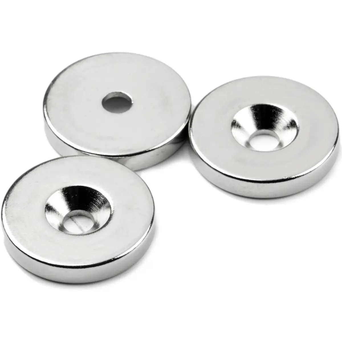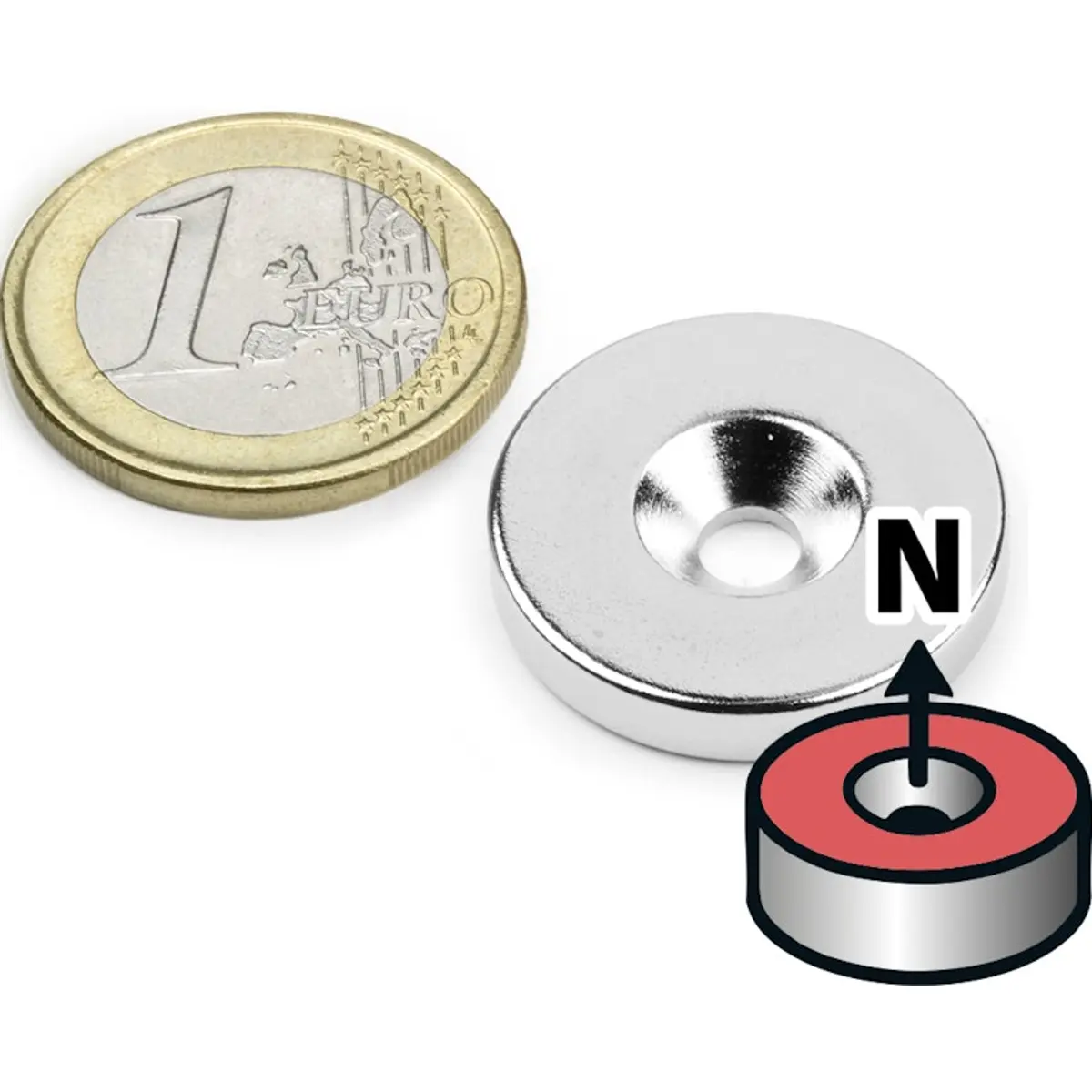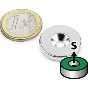Ímanes de disco de neodímio com furação escareada e altura de 4 mm, que podem ser fixados com um parafuso de cabeça escareada. Este íman possui o polo Sul no lado da furação, permitindo a sua combinação com o íman 096-6204. Em conjunto, é especialmente indicado para uniões ocultas ou amovíveis em construção de móveis, design de interiores, montagem de stands, mobiliário comercial ou em dispositivos técnicos.