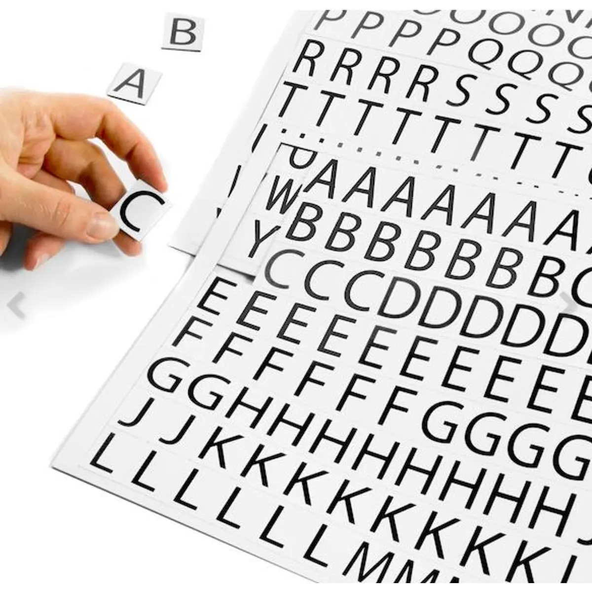 Estes conjuntos com letras ou números magnéticos contêm duas folhas magnéticas no formato A4 com letras e sinais de pontuação ou números e caracteres especiais. As letras e números são impressos em preto sobre fundo branco e o tamanho da fonte varia entre 17 mm e 21 mm.