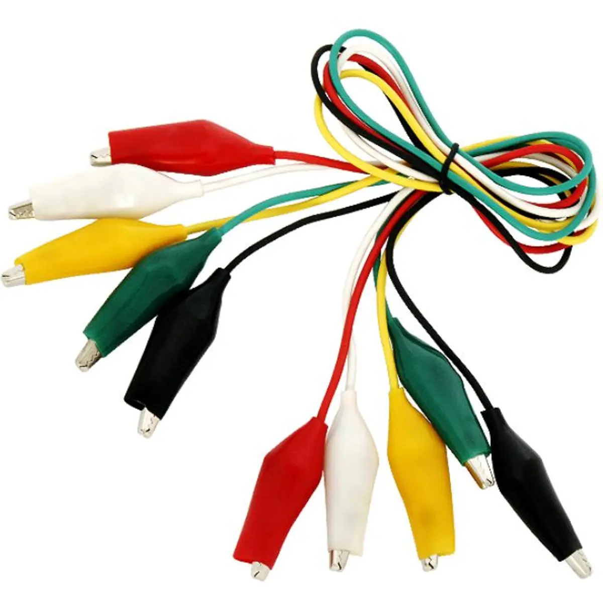 Conjunto de cinco crocodilos de 28 mm com cabo de 45 cm, isolados por cores (preto, vermelho, branco, amarelo e verde) para ligações seguras em prototipagem eletrónica. O condutor é aço niquelado, oferecendo boa condutividade e durabilidade. Ideal para ligações rápidas em bancadas, medições, testes e prototipagem em circuitos.