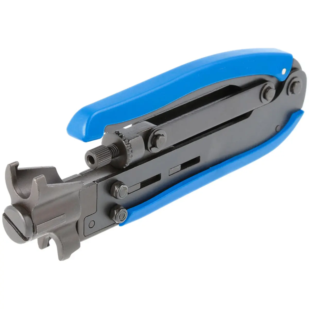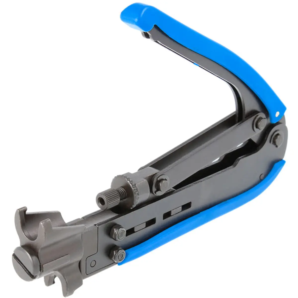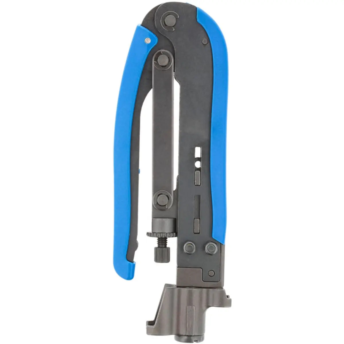 Alicate de cravar para conectores F de compressão compatível com RG-59, RG-6 e RG-11, com terminais F, Mini F, BNC e RCA. Ideal para CATV, satélite e sistemas de segurança, oferecendo conexões seguras e duráveis, com design universal para a maioria dos conectores de compressão. Dimensão de 174 mm facilita o manuseio e a precisão.