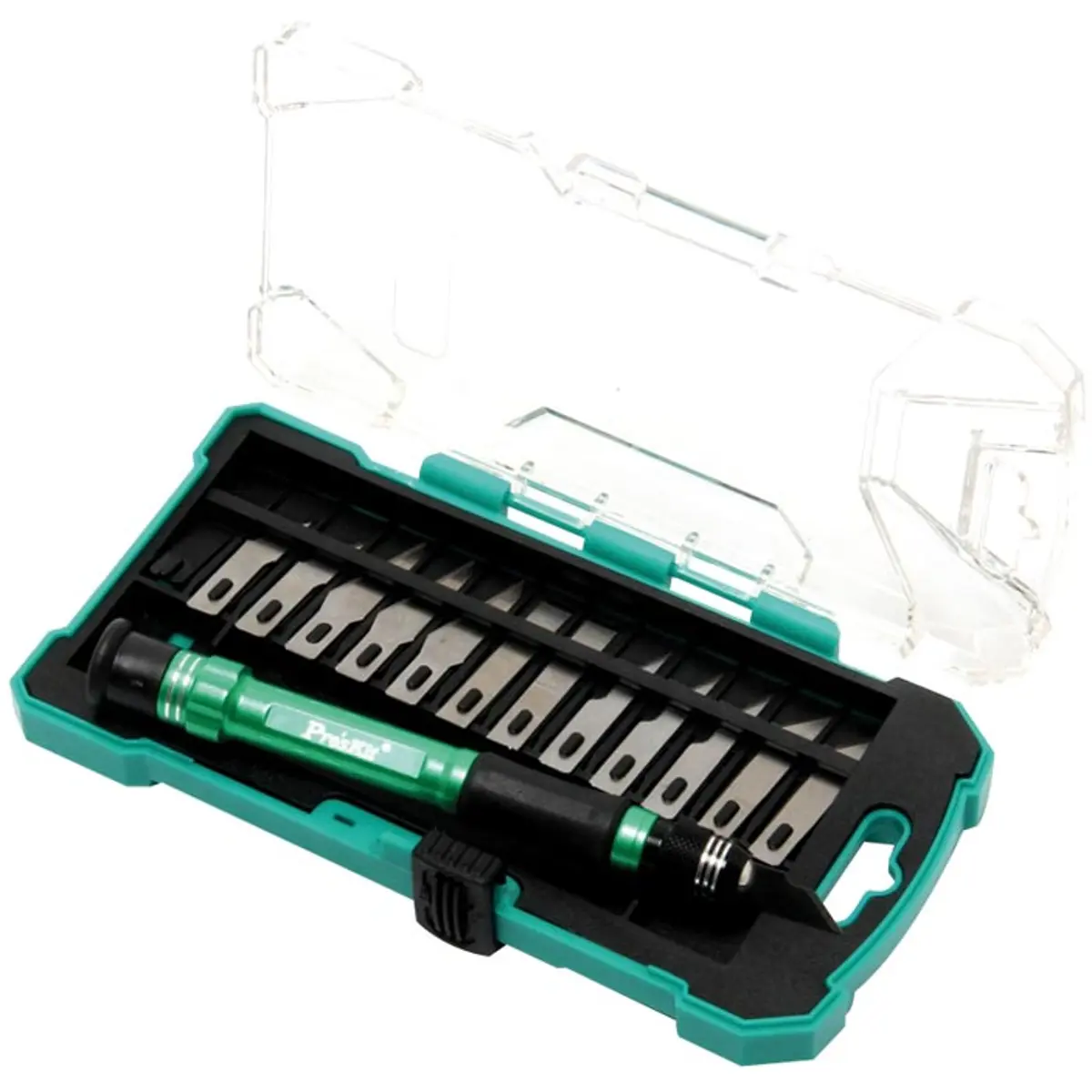 Estojo compacto composto por uma faca de punho de alumínio de alta qualidade com uma área de fixação de borracha antideslizante e 13 lâminas de precisão substituíveis.