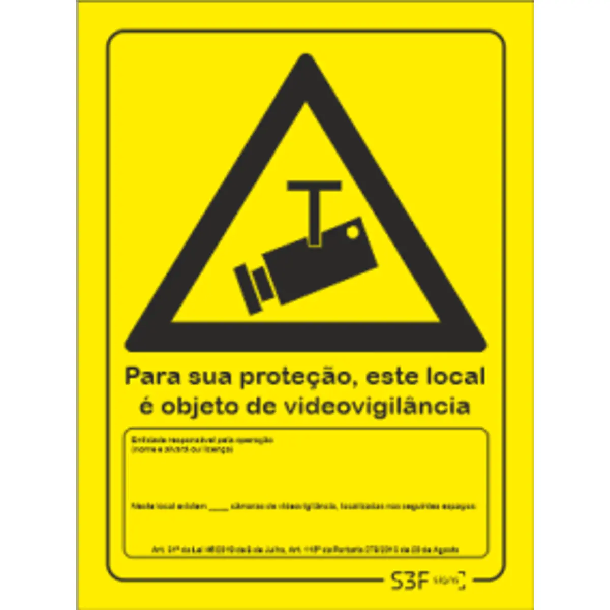 Placa de sinalização em PVC rígido de 2 mm para videovigilância em estabelecimentos. Impressão digital de elevada qualidade, com tintas resistentes aos raios UV, assegura visibilidade duradoura. Não contém toxinas, fósforo nem chumbo. Certificada ISO 9001:2008 e ISO 14001:2004, bem como CERTIF. Dimensões 150 x 200 mm; ideal para sinalização em ambientes interiores ou exteriores, conforme exigências legais.