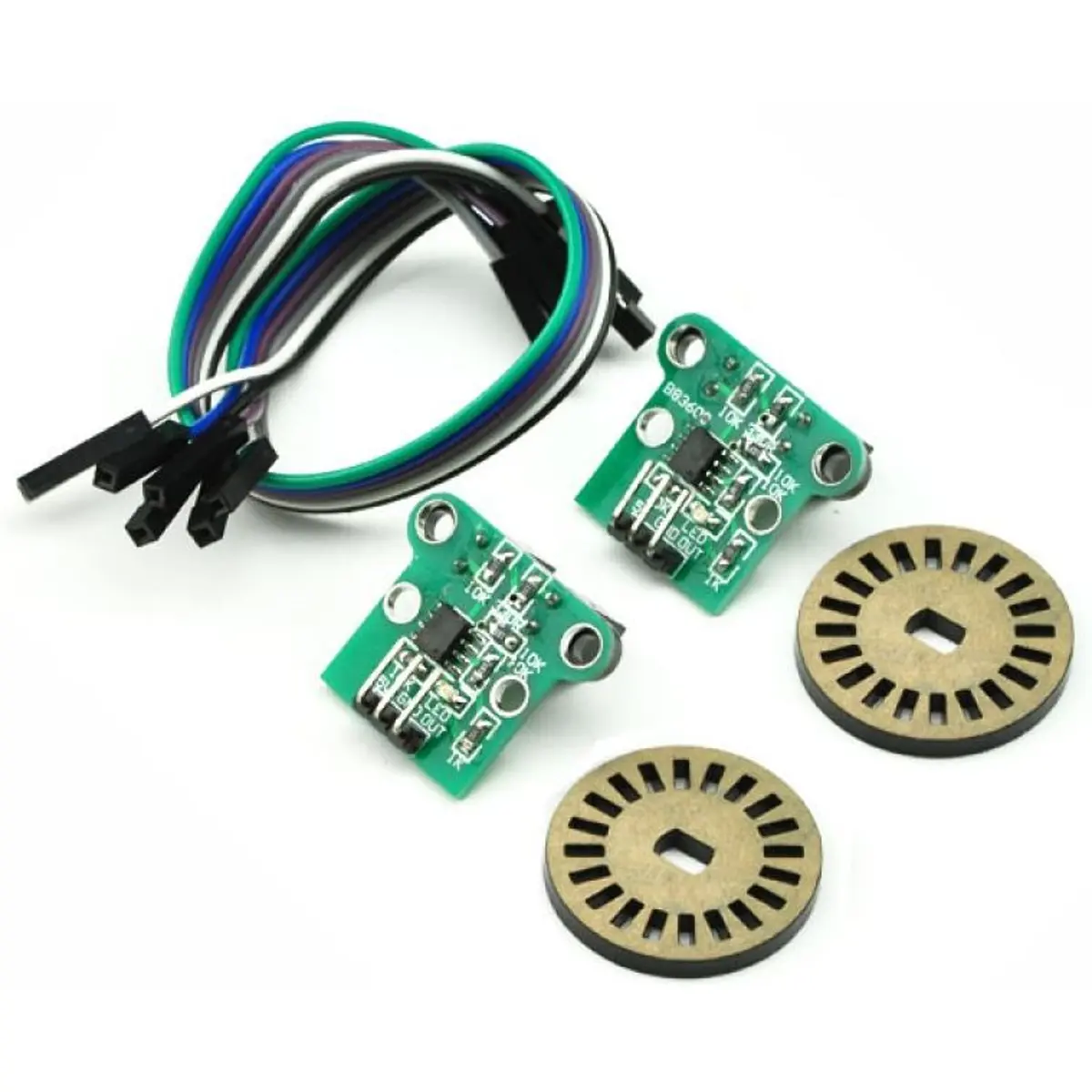 Este codificador pode medir a velocidade do motor através do "disco de código preto" (este kit inclui um disco de código de 2 peças com diâmetro de furo de formato D de 4 mm). Este codificador usou um sensor de feixe de passagem. Tem alta resolução e sinal de saída é uma onda quadrada padrão .