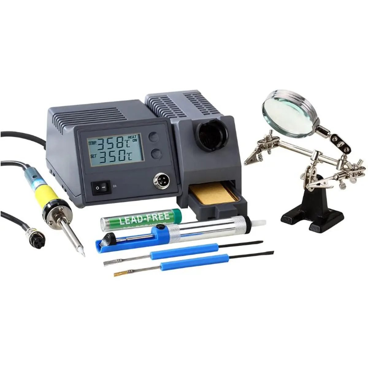 Kit completo de estação de soldar digital 48W com suporte de crocodilos com lupa, bomba dessoldadora, 10 g de solda de 1 mm e acessórios de limpeza. A estação oferece soldagem precisa e controlada, facilitando montagens e reparações em circuitos. O conjunto inclui todos os itens essenciais para começar a trabalhar de imediato, incluindo solda, ferramentas de limpeza e o equipamento de remoção de solda para solucionar soldaduras indesejadas com eficiência.