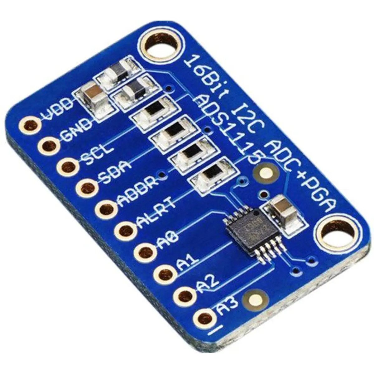 Conversor analógico digital 4 canais ADS1115 é um componente indicado para circuitos onde o microcontrolador não possui um ADC (Analog Digital Converter) embutido, ou quando você precisa de um conversor de alta precisão no seu projeto. Funciona com tensões entre 2 e 5.5VDC, e a tensão máxima nos pinos analógicos é igual à tensão de alimentação. Os pinos analógicos podem ser programados como 4 pinos independentes, ou dois canais diferenciais.