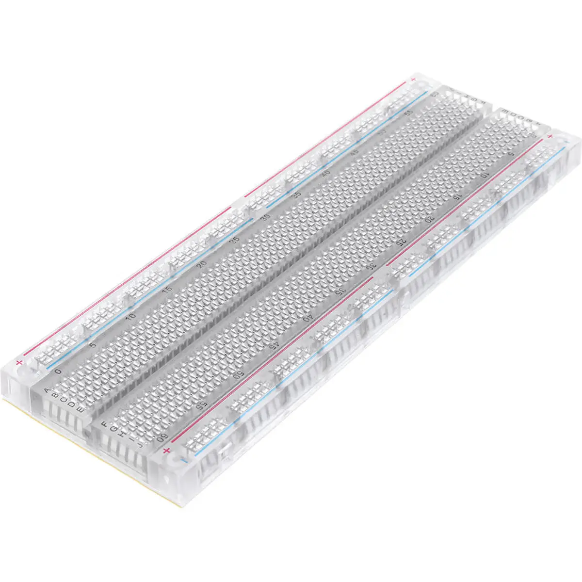 Placa de ensaio transparente com 830 contactos destinada à prototipagem de circuitos eletrónicos. Com tamanho compacto de 165 x 54 x 8,5 mm e base com fita bi-adesiva para fixação estável durante os testes, facilita a organização de ligações e a visualização das ligações. Ideal para estudantes, makers e profissionais de hardware que procuram prototipagem rápida, ensino prático e demonstrações de circuitos sem necessidade de ferramentas especiais.