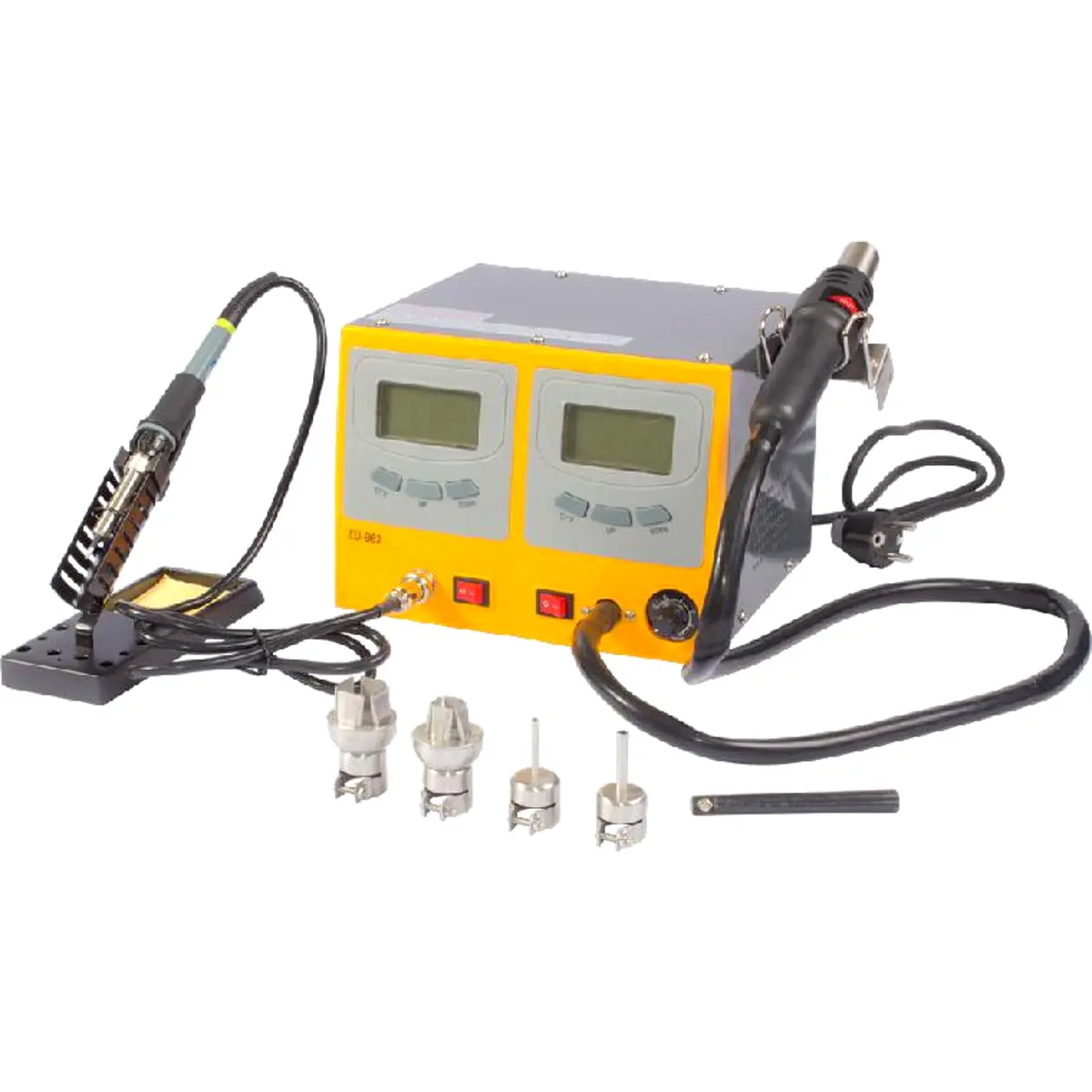 Estação de Soldar e Dessoldar Profissional ideal para todo o tipo de componentes electrónicos, modelo ZD-982. Inclui Ferro de Soldar, com resistência cerâmica, temperatura ajustável de 160-480ºC, com tensão de 24V e consumo de 60W. O ar quente SMD apresenta uma capacidade de 24l/min e potência de 320W.