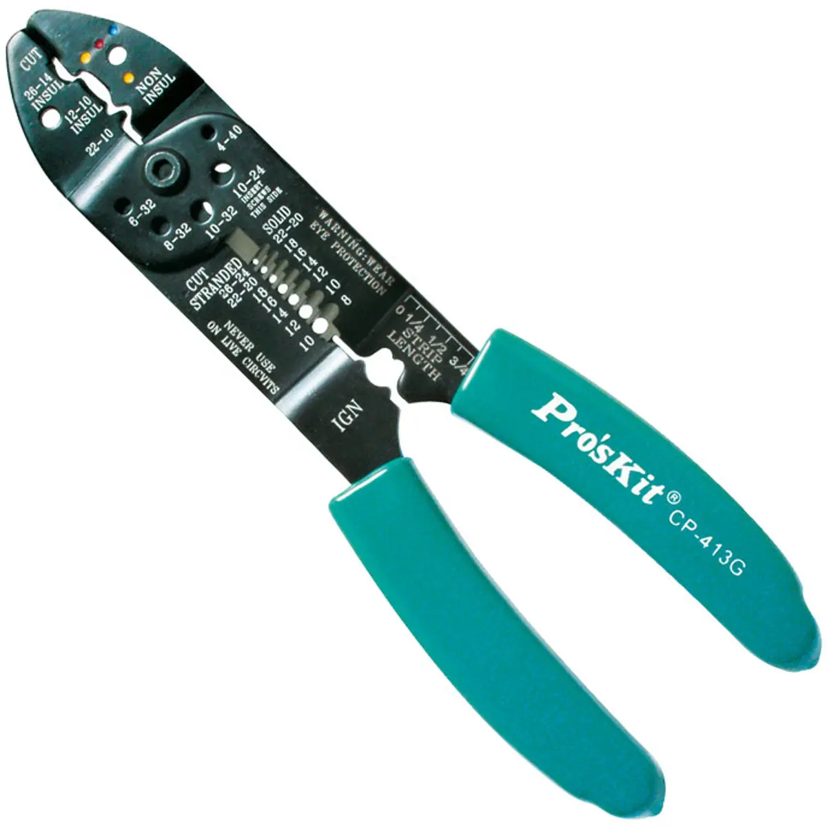 Pro'sKit CP-413G - Alicate de cravar terminais isolados 0.14-6.0mm² e não isolados fechados 0.34-6.0mm² c/ descarnador e cortador