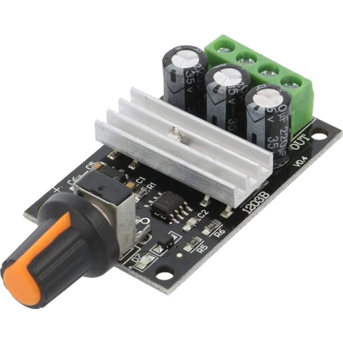 Este módulo é um controlador de motor DC com potenciómetro, com 1 canal, alimentação entre 6 e 28V DC, corrente máxima de 3A e potência máxima de 80W.