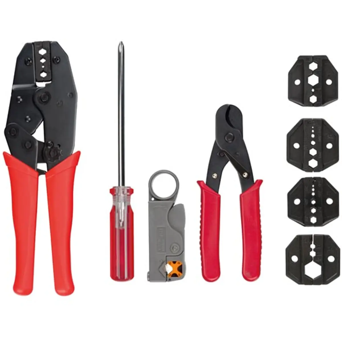 • 1 Alicate de cravar com um conjunto de 5 mandíbulas para cravar de todos os tipos de conectores coaxiais