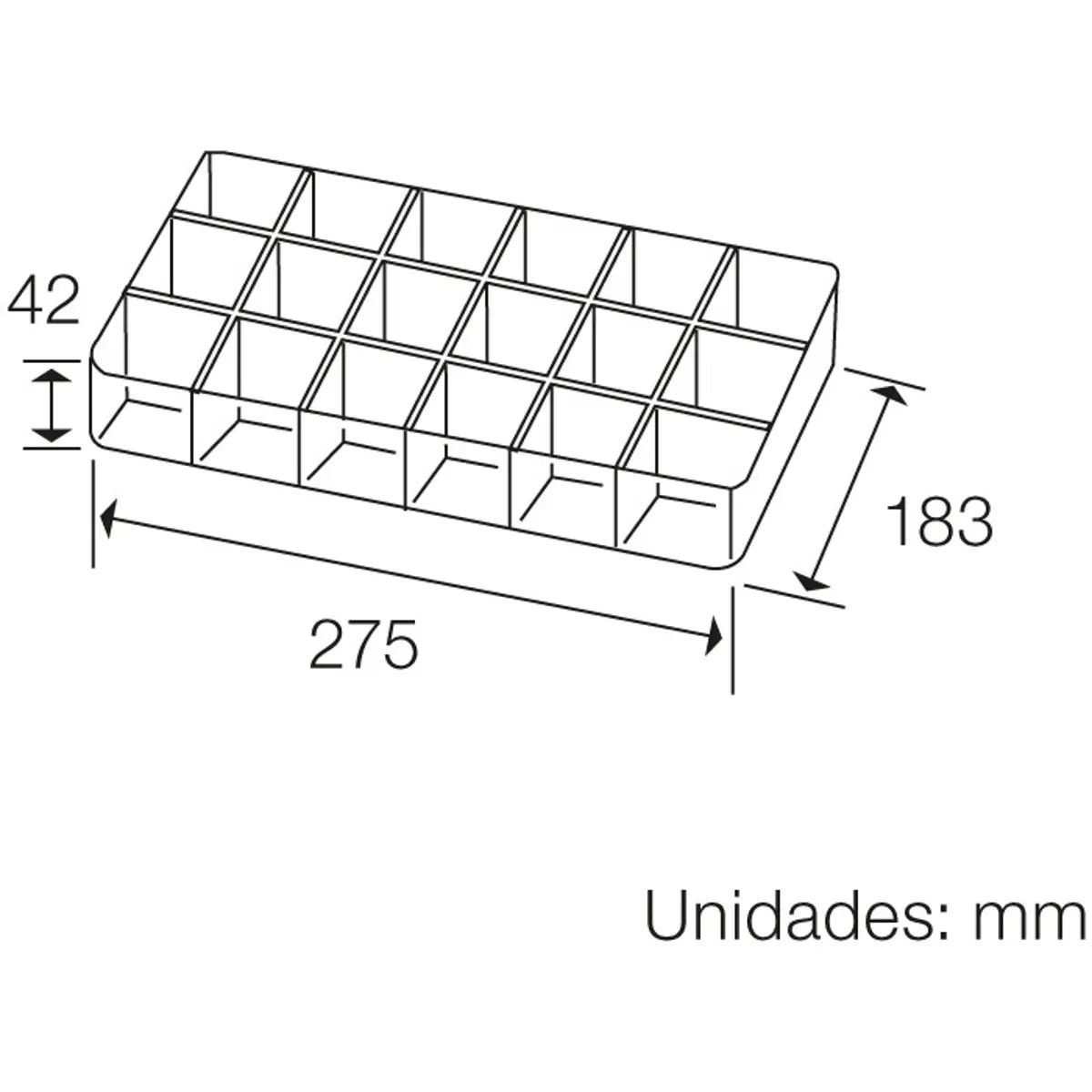 Caixa plástica de armazenamento de componentes, com 18 compartimentos e dimensões de 275x183x42 mm. Fabricada em polipropileno, oferece organização prática para peças pequenas, para oficinas, hobby ou bancada de montagem. Ideal para classificar cabos, parafusos, conectores e outros componentes, mantendo tudo acessível e protegido. Leve, robusta e de uso doméstico ou profissional, permite guardar e transportar com facilidade, promovendo eficiência e organização no espaço de trabalho.