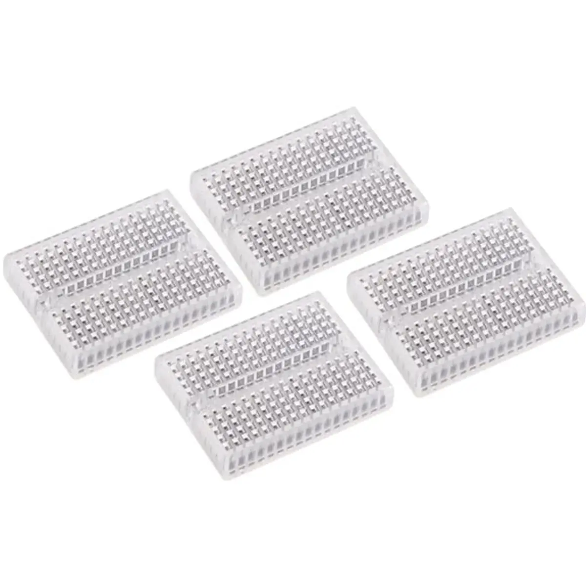 Conjunto de 4 mini placas de ensaio tipo breadboard com 170 contactos, de cor transparente, adequado para prototipagem eletrónica. Suporta até 30 V e 3 A, com dimensões compactas de 45 x 35 x 10 mm, facilitando experiências de montagem em bancada, ensino e desenvolvimento de circuitos sem solda.