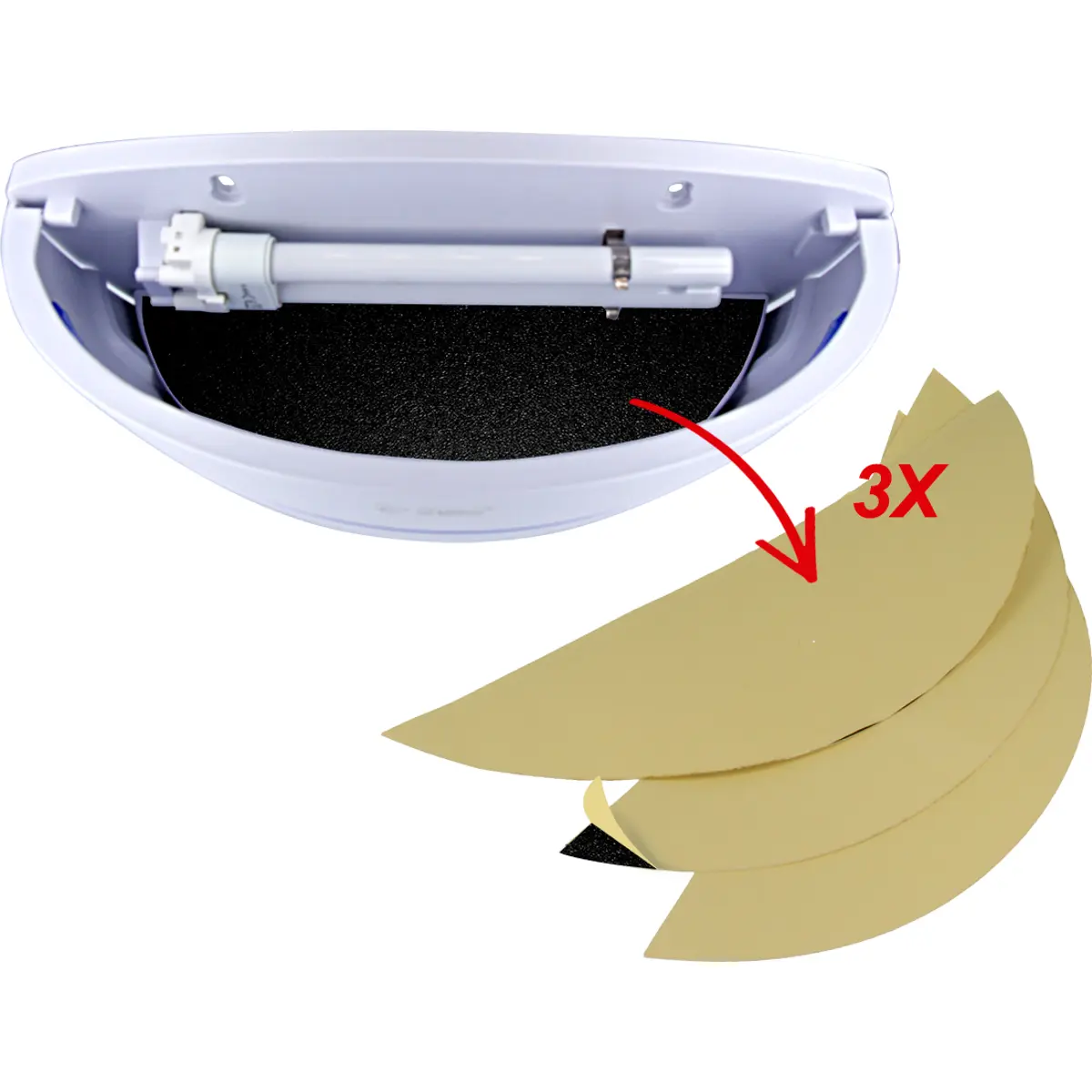 Conjunto de 3 adesivos em formato de meia-lua para substituição do adesivo antigo que já não cola devido à acumulação de insetos. Troca rápida e simples, sem necessidade de ferramentas, para manter a eficácia do exterminador de insetos. Ideal para manutenção regular, assegurando a continuidade do funcionamento do dispositivo de controlo de pragas.