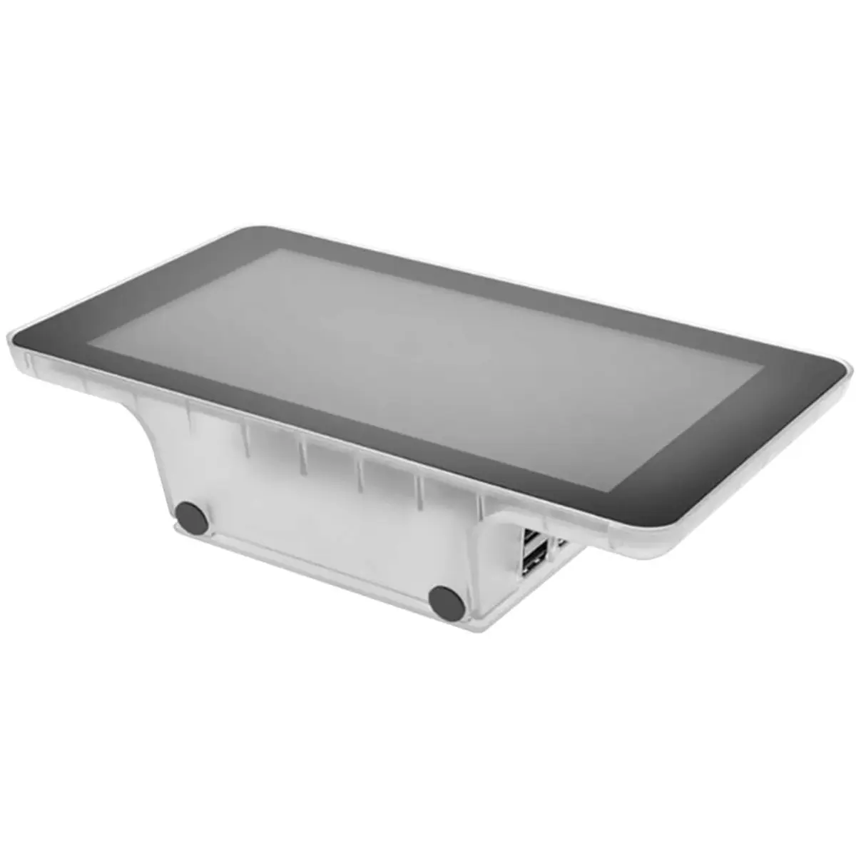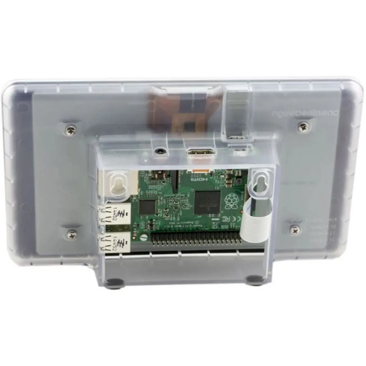 Caixa de proteção em ABS transparente para encaixar o display táctil de 7 polegadas e a placa na traseira. Tampa traseira removível, acesso facilitado aos contactos GPIO e às ligações internas. Montagem em parede com furos integrados; aberturas para ligações. Material resistente ao fogo (UL94 HB). Dimensões externas: 197 x 46,7 x 115,6 mm. Compatível com placas 2B, 3B, 3B+ e B+. Ideal para projetos com display integrado e montagem simples.