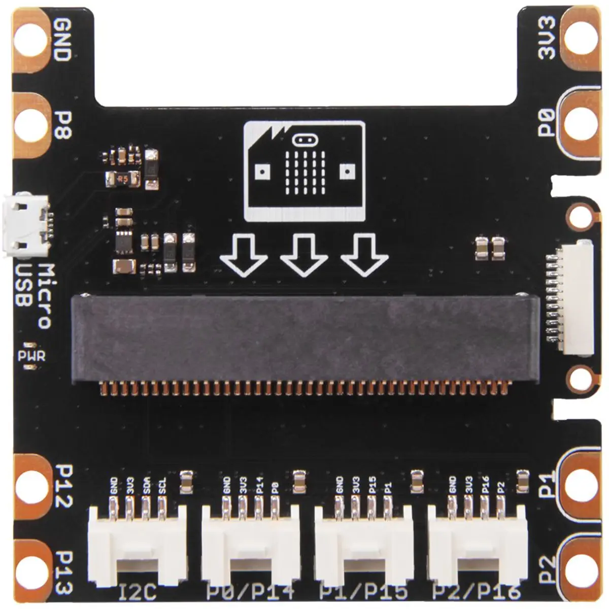 Além disso, inclui também algumas pinagens que possuem funções especiais como P0, P1, P2 que possuem função touch. Inclui também interface micro USB on-board, onde pode alimentar o micro:bit através da shield.
