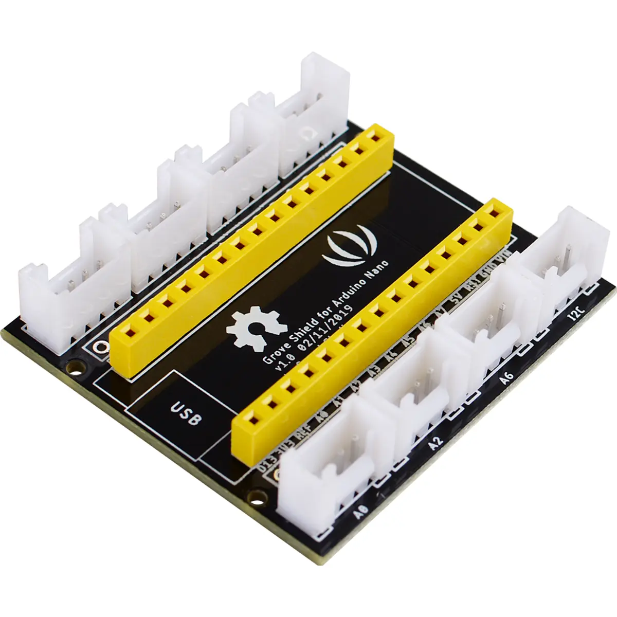 Este Shield pode ser usado tanto no Arduino Nano como também o Seeeduino Nano. Este shield extrai os pinos da placa-mãe e expande para 8 conectores Grove, incluindo 3 conectores digitais Grove, 3 conectores analógicos Grove, 1 conector Grove I2C e 1 conector Grove UART.