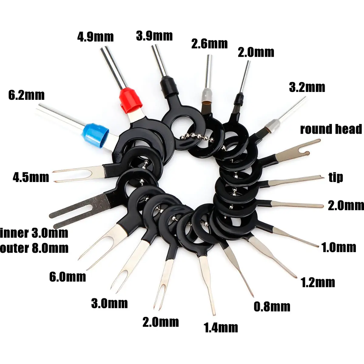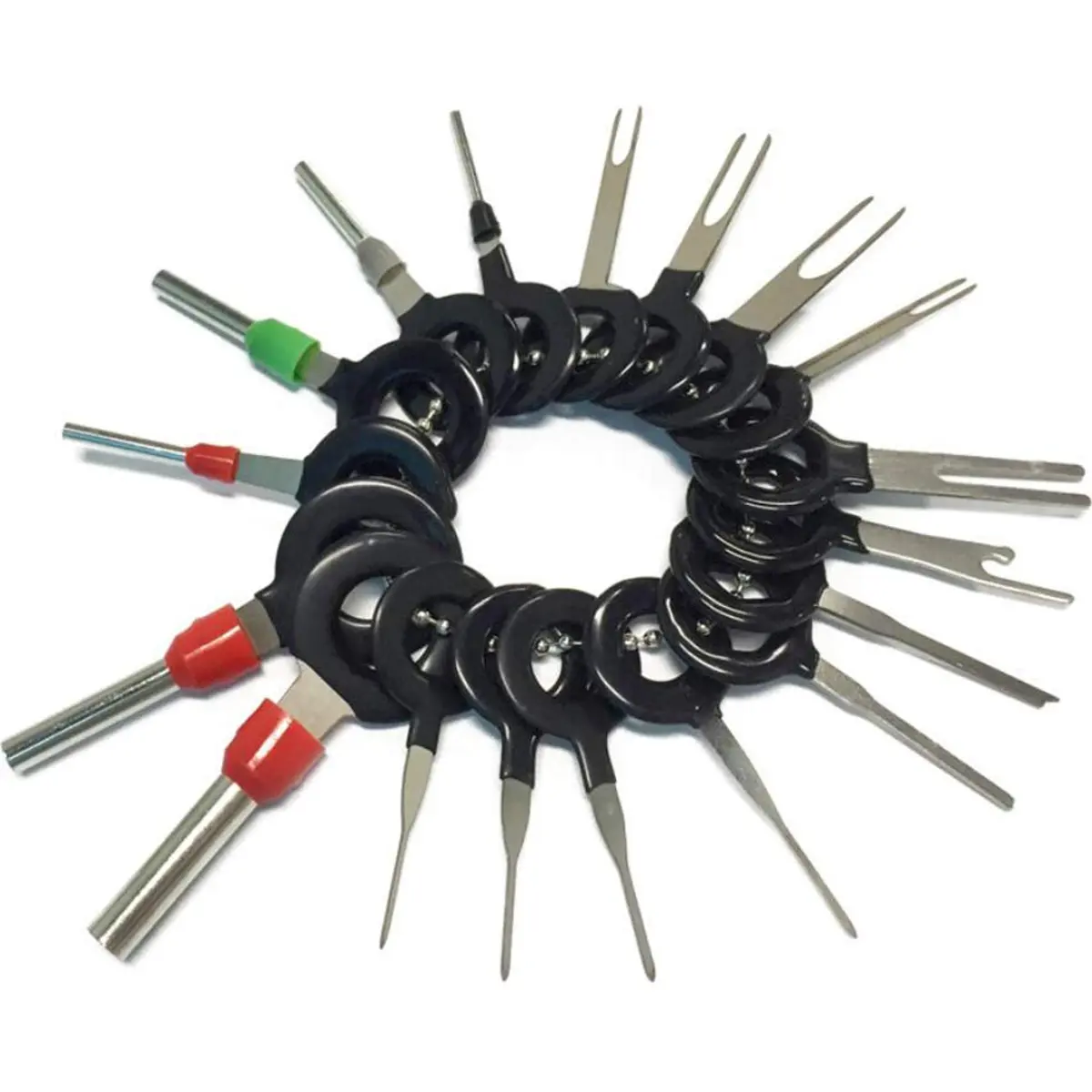 Conjunto de 18 extractores de terminais universais em aço inox 301, ideal para desmontar a maioria dos terminais de fichas de automóvel. Esta ferramenta indispensável facilita trabalhos de mecânica e eletricidade automotiva, sendo adequada para profissionais e utilizadores comuns. Fabricada em aço inox resistente, oferece durabilidade e precisão para uma remoção segura de terminais sem danificar cabos ou fichas.