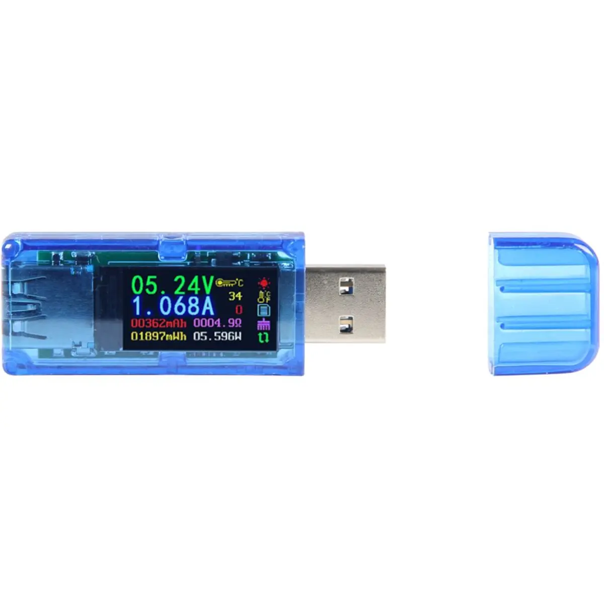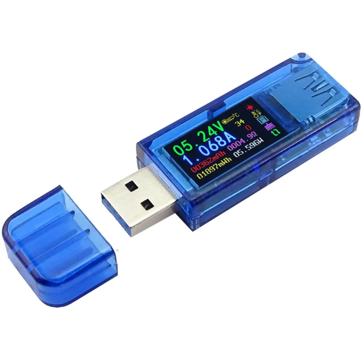 Multímetro USB compacto para medições de tensão (3,7 - 30 V), corrente (0 - 4 A) e potência (0 - 120 W) com ecrã IPS de 0,96 polegadas e atualização de 2 Hz. Suporta USB 3.0 (compatível com USB 2.0) e reconhecimento de carregamento rápido QC2.0/QC3.0, Apple 2.4A/2.1A/1A/0.5A, Android DCP e Samsung. Temperatura 0 - 80 ° C (0 - 45 ° C operacional, ±3 ° C); impedância de carga 1 - 9999,9 Ω; capacidade 0 - 99999 mAh; energia 0 - 999,99 Wh. Dimensões 64 x 22 x 12 mm, peso 28 g. Ideal para monitorizar baterias portáteis e carregadores.