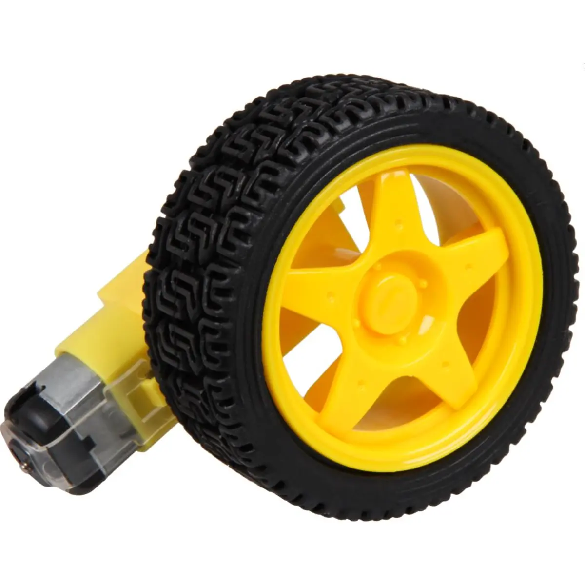 O motor da engrenagem tem uma grande faixa de tensão e um eixo de dupla face, o que o torna perfeito para a construção de modelos e protótipos, especialmente porque incluí a roda com pneu de borracha e jante de plástico. O eixo pode por exemplo ser usado para a montagem de um disco perfurado que pode selecionar com um sensor de rotações.