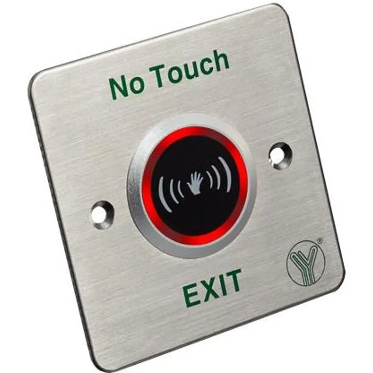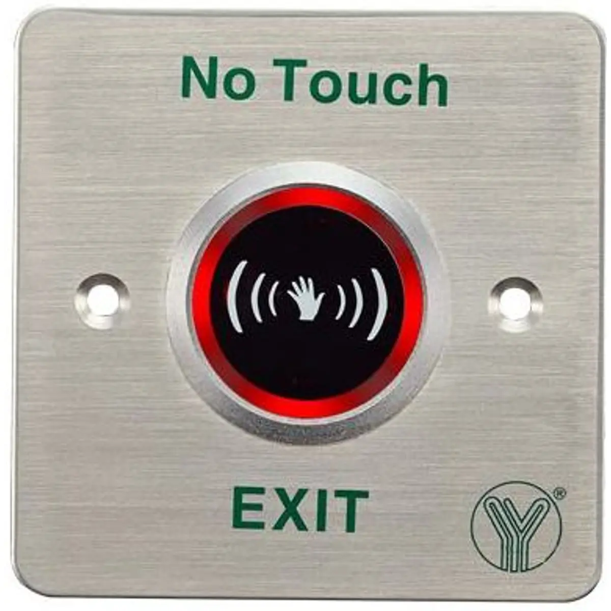 Botão de saída sem contacto com sensor infravermelho e LED indicador para montagem encastrável. Alimenta-se a DC 12 V e fornece saída de contacto NO/NC/COM, com detecção de proximidade entre 4 e 12 cm e atraso programável de 1 a 25 segundos. O invólucro em aço inoxidável mede 86 x 86 x 25,7 mm, pesa 200 g e funciona entre -20°C e +55°C com humidade relativa de 0 a 95%. Testado até 1.000.000 utilizações, é resistente e adequado para aplicações industriais.
