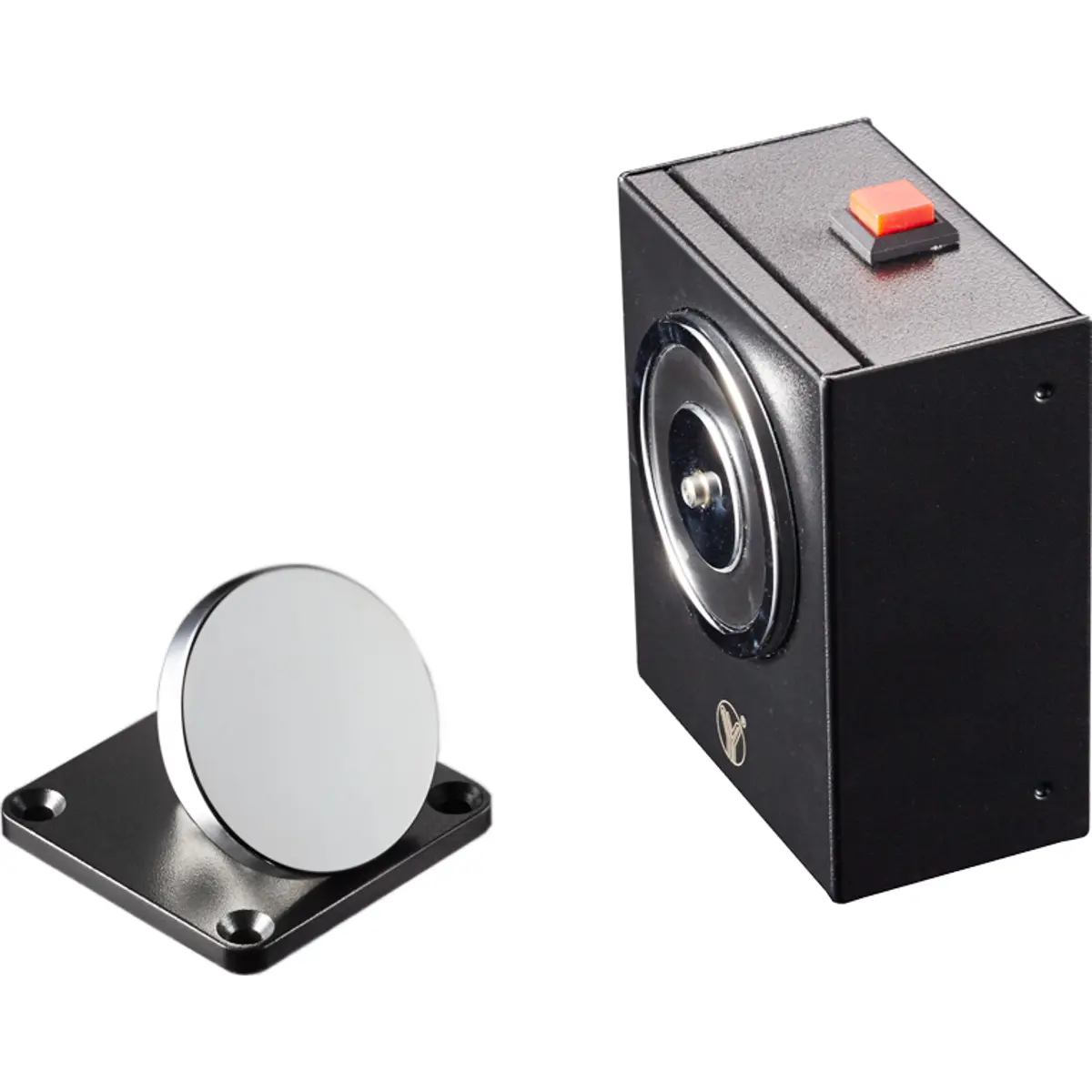 Retentor eletromagnético de portas simples com força de retenção de 50 Kg, operável em 12VDC ou 24VDC (configurável via jumper). Possui baixo consumo de energia, proteção contra corrente inversa e liberta automaticamente a porta em caso de incêndio. Inclui botão de libertação manual e design anti-magnetismo residual. Dimensões de 65 x 65 x 41 mm (placa magnética) e 40 x 85 x 70 mm (retentor), peso 900 g. Compatível com portas simples, 1 folha articulada e portas RF. Certificações MA CE-EMC REACH WEEE.