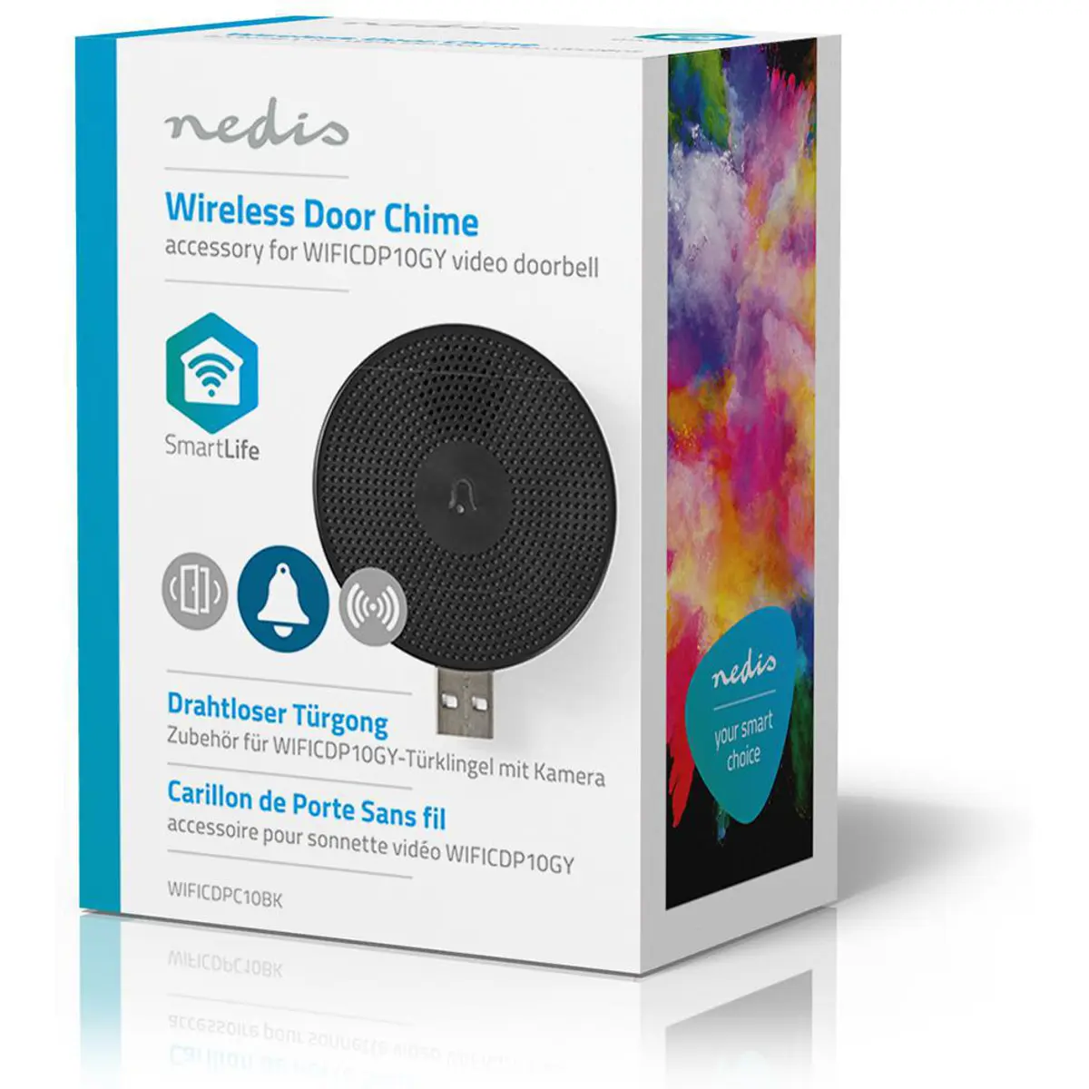 Extende as funções da campainha de vídeo sem fios via USB, permitindo o controlo da melodia e do volume no SmartLife e a possibilidade de ligar várias campainhas sem fio a uma única campainha com vídeo. Compatível com Nedis SmartLife e Smart Life (TUYA). Opera com tecnologia sem fios de 433 MHz, alimentação USB de 5 VDC, até 80 dB de volume e quatro sons, facilitando a monitorização da porta com instalação flexível.