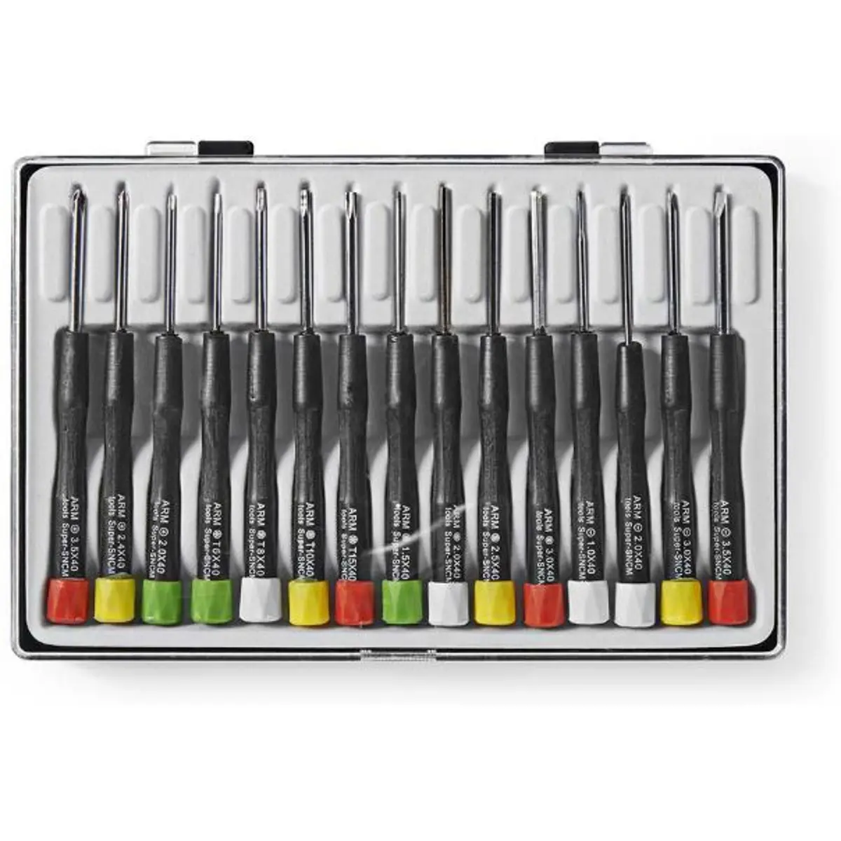 Conjunto de 15 chaves de precisão com tipologias fenda, PH, TX e hexagonais. Inclui 4 chaves de ponta plana (1,0/2,0/3,0/3,5 mm), 3 de PH (2,0/2,5/3,5 mm), 4 TX (TX6, TX8, TX10, TX15) e 4 hexagonais (1,5/2,0/2,5/3,0 mm). Ideal para montagem, reparação e trabalhos de precisão, fornecido numa caixa prática para organização e transporte.