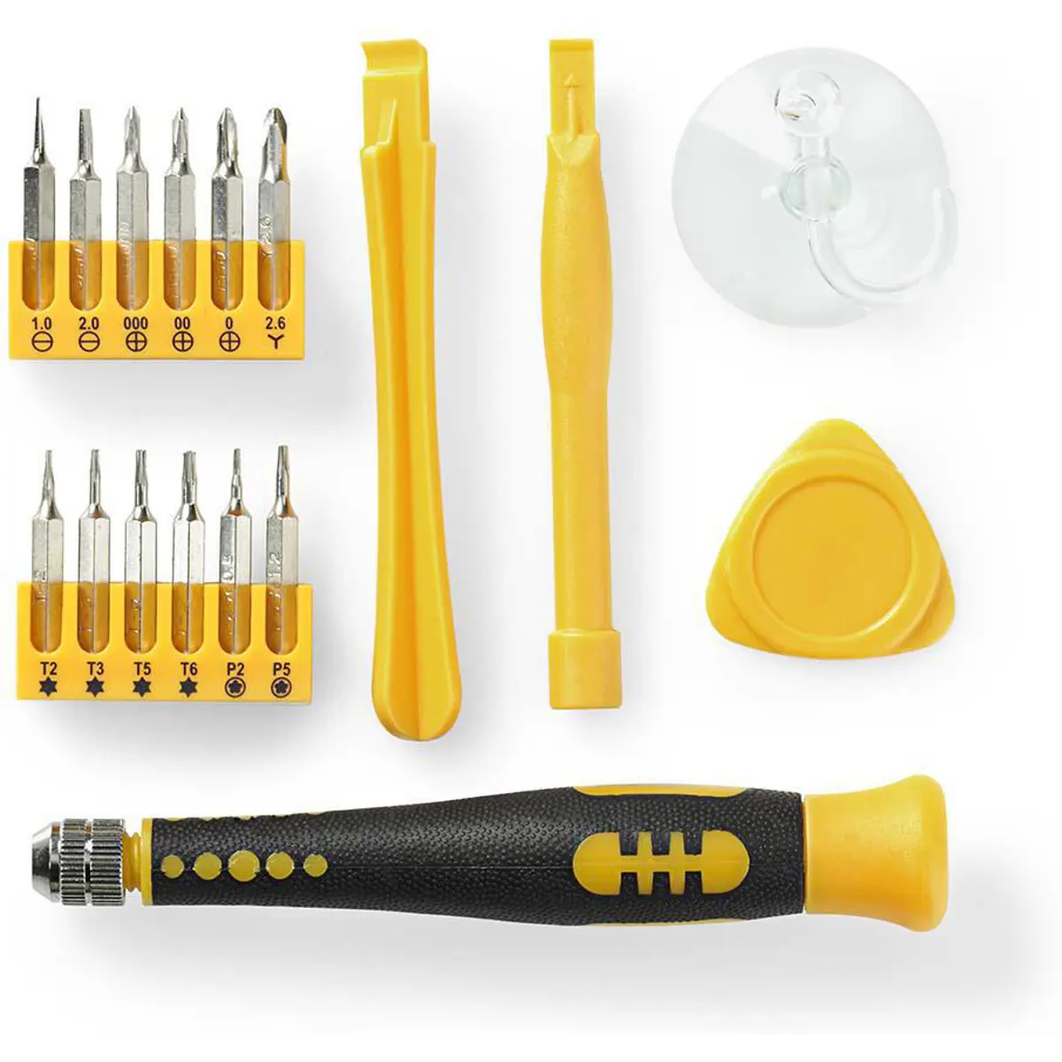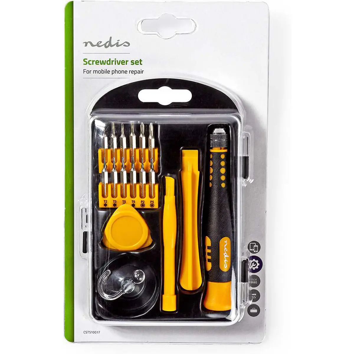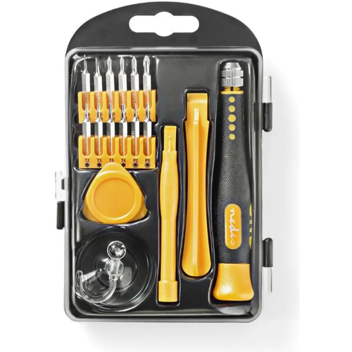 Este conjunto de chaves e ferramentas de reparação para computadores, smartphones e dispositivos electrónicos da Nedis® dispõe de 17 ferramentas essenciais para reparar e montar seus dispositivos.