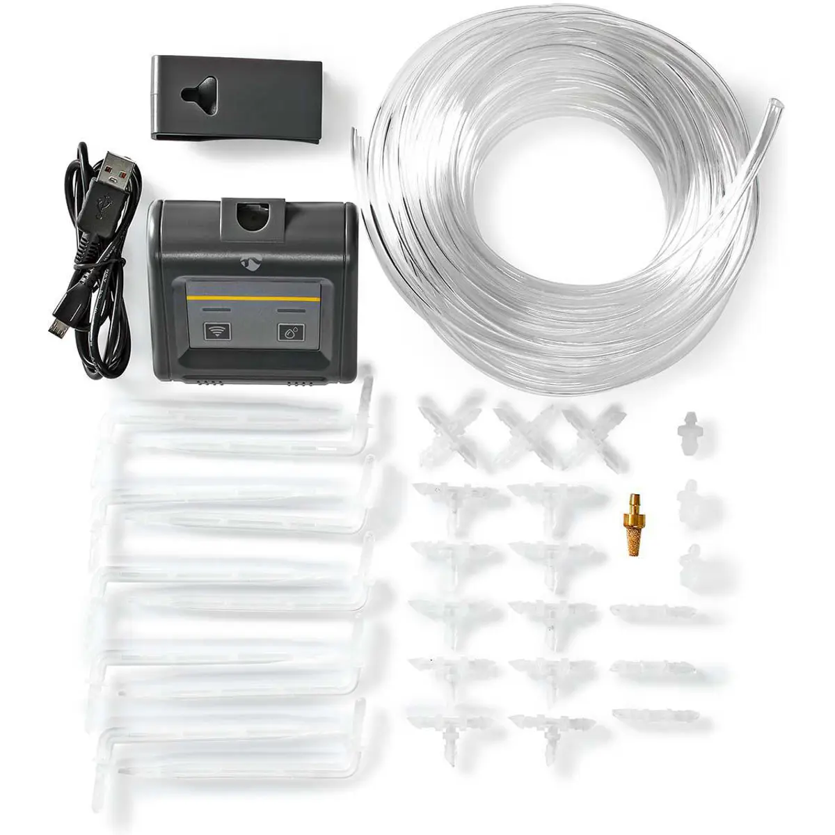 Coloque a bomba de água Nedis SmartLife perto das suas plantas. Corte os tubos de 10 metros incluídos com todos os seus acessórios e use-os para alcançar as plantas necessárias. Através de um recipiente de água de sua escolha: balde, garrafa ou regador.