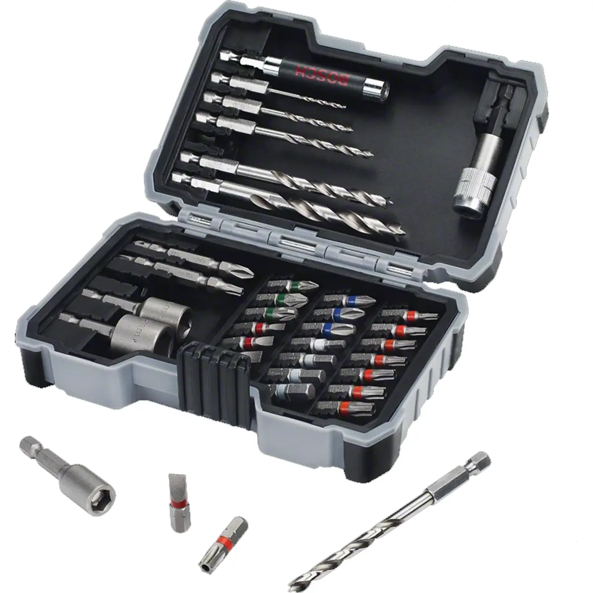 PH1, PH2, PH3 / PZ1, PZ2, PZ3 / S3/4/5/6 / HEX3/4/5/6 / TH10, TH15, TH20 (2x), TH25, TH27, TH30, TH40 / Chaves sextavadas 6/8/10 mm / HSS 2,0/3,0/4,0/5,0/6,0/8,0 mm / Ponta de aparafusar dupla PH2/PZ2 / Ponta de aparafusar dupla Th20/Th25