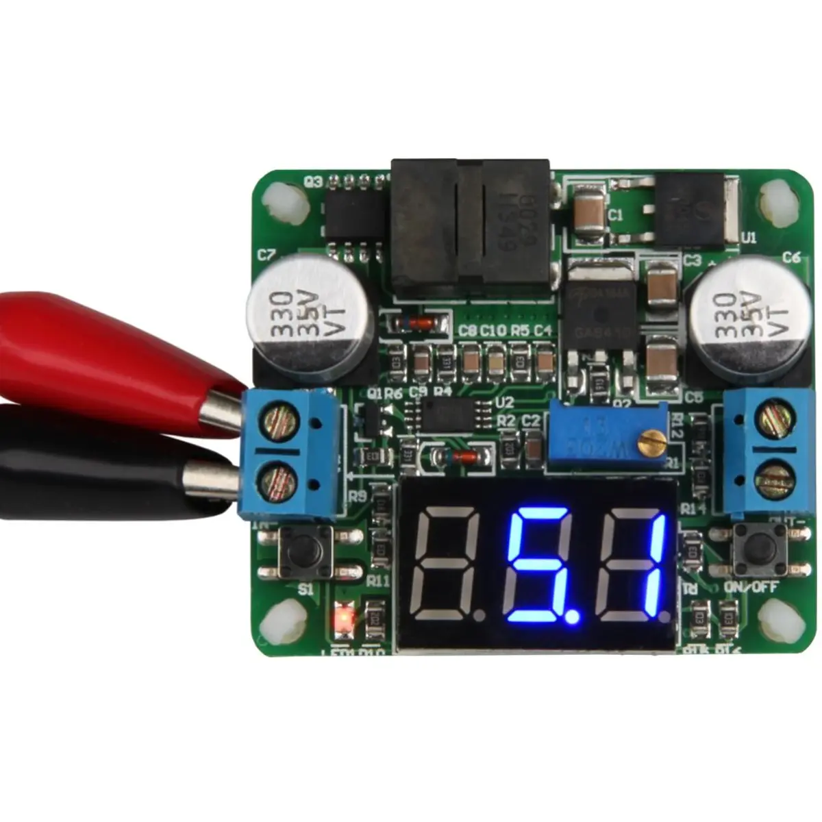 O conversor de tensão livremente configurável possui a função "Step UP" e "Step Down". A tensão pode ser ajustada com um trimmer individualmente e pode ser visível através do display. A corrente máxima é de 25 W ou 2 A.